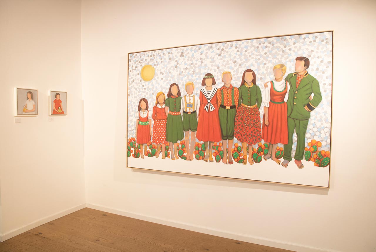 ״לא. אלה תמיד ילדות, ותמיד עם קארה. זה כבר הפך להיות סימן ההכר שלי. בהרבה מקרים אני מציירת מתוך האלבום המשפחתי שלי, וכמעט תמיד מופיעה בציורים שלי דמות אחת בודדה. אחד מהציורים יוצאי הדופן הוא כזה שמוצג עכשיו בתערוכה, שההשראה אליו היתה משפחת פון־טראפ מהסרט צלילי המוזיקה. זה סרט שהייתי רואה אינסוף פעמים כילדה.