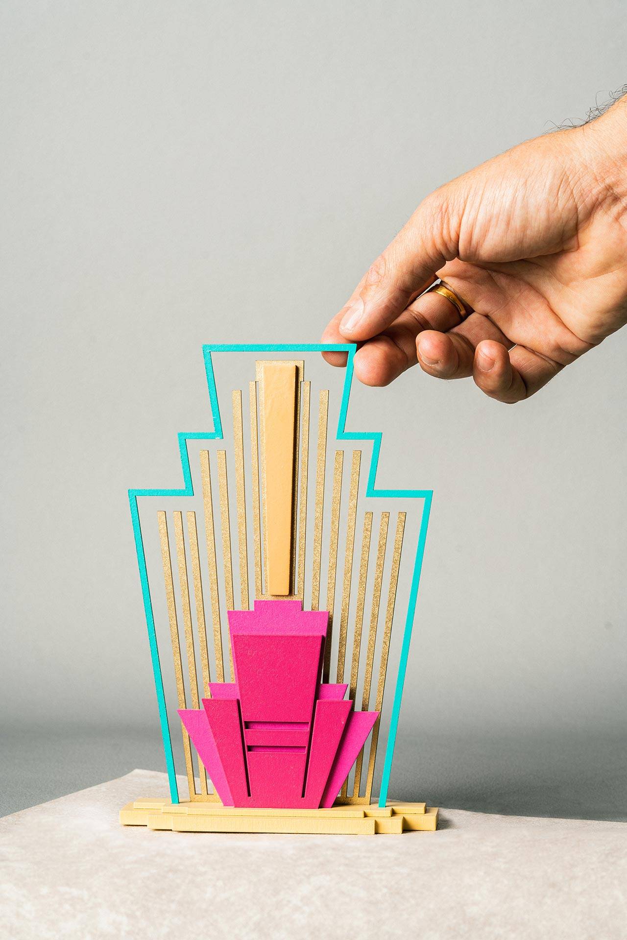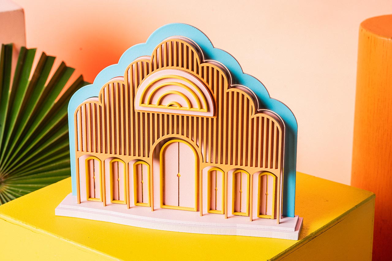תוך כדי העבודה על הסקיצות התחלתי לדמיין אותן בתלת־ממד כמקטים קטנים. עבדתי על תוכנת תלת־ממד, חיתוך לייזר וצביעה בשעות הלילה המאוחרות. ככה יצרתי לעצמי סטים קטנים שהם הפנטזיה האישית שלי, פרי דמיוני