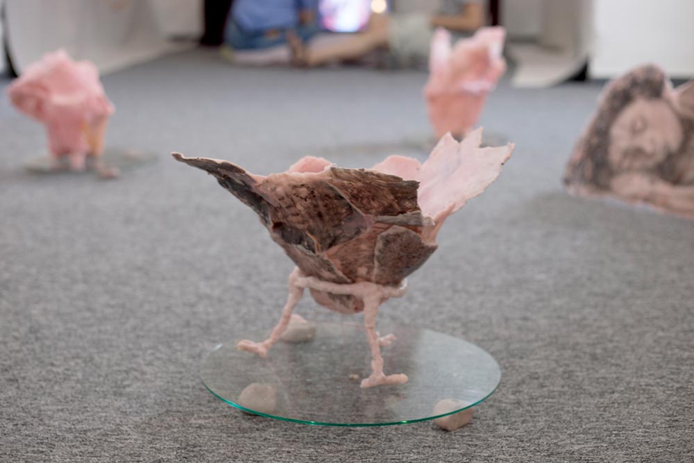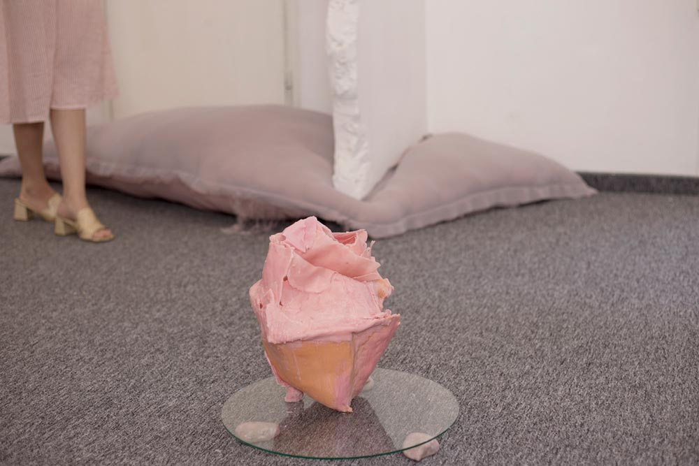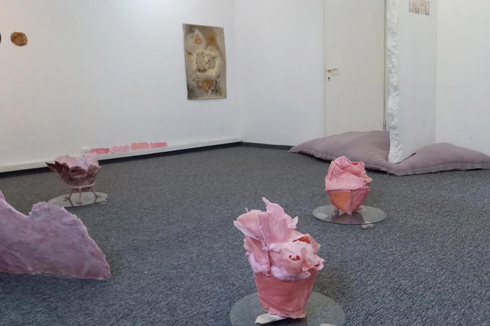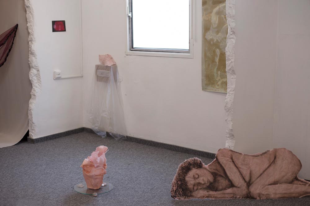 אני מציגה בימים אלו (עד 6.8) תערוכת יחידה ״שתיהן אותה אחת״ (אוצר: חגי אולריך), בגלריה של לחם ושושנים (רחוב העליה 45, תל אביב). התערוכה עוסקת במנגנוני התמודדות עם פחד, שמירה ואיחוי של הגוף. אני בודקת את הגבולות החומריים של הפסלים שלי, שעשויים בעיקר מטכניקות שונות בשעווה והדפסי מונוטייפ, עד כמה עדינים ושבירים הם יכולים להתקיים בלי לקרוס. האמת היא שחלקם לפעמים קורסים, לכן צפויה השתנות תמידית במהלך החודש של התערוכה.