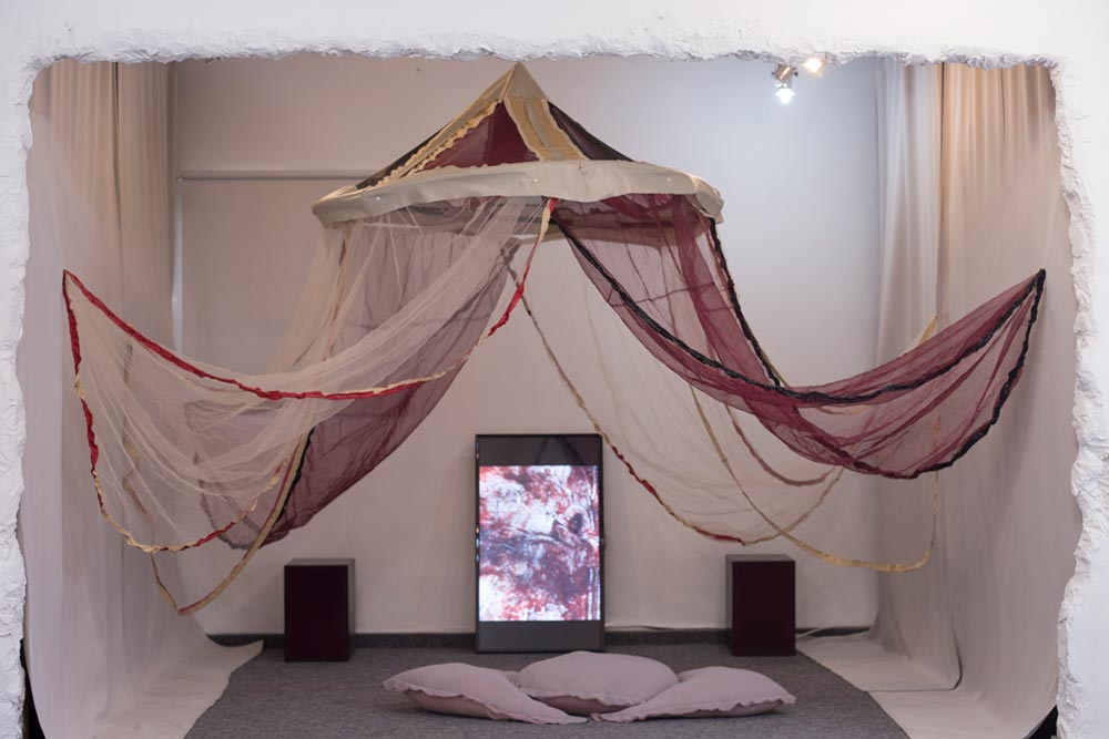 מרבית הדימויים בתערוכה מסמלים מערכות שונות של שמירה פנימית וגופנית. בכל פעם אני מקווה מחדש שעצם ההטמעה שלהם בחומר, תטמיע אותם גם לתוכי, תממש אותם למציאות שלי; קצת כמו התקווה שמלווה יצירה של קמע. חוץ מזה, נקודת המבט הטובה ביותר על התערוכה, היא בישיבה על השטיח או על הכריות.