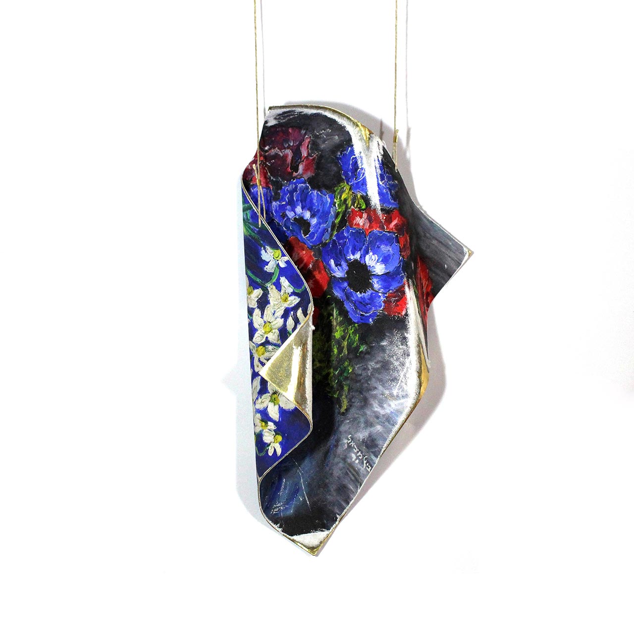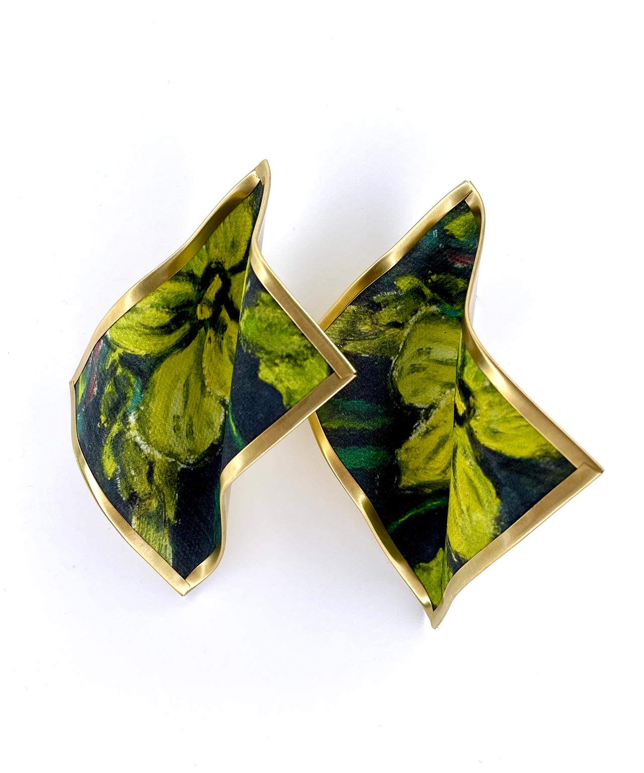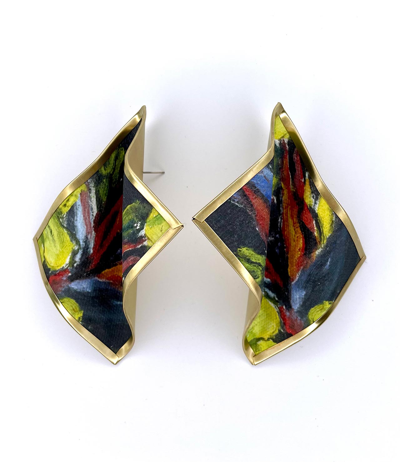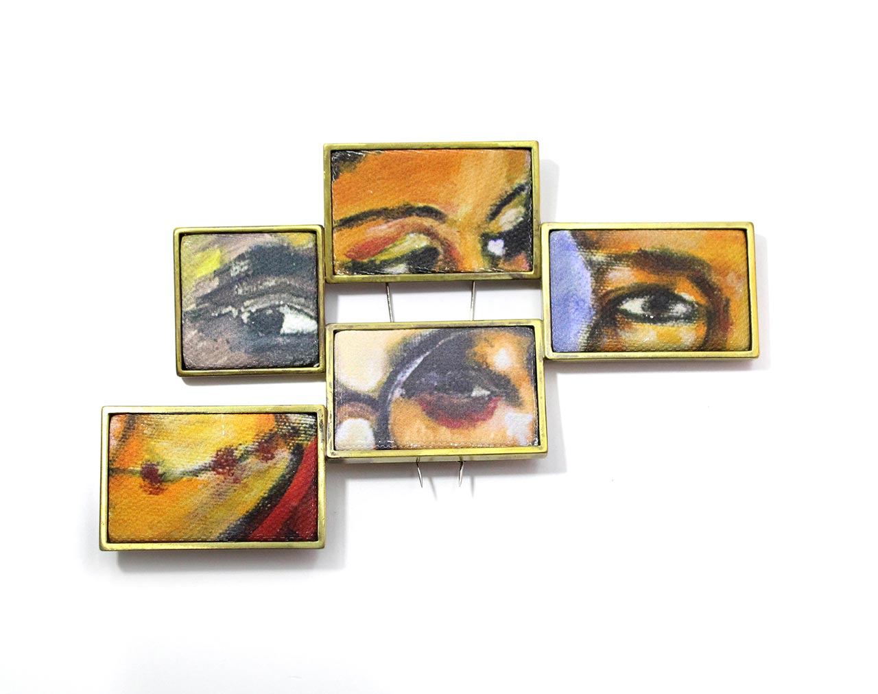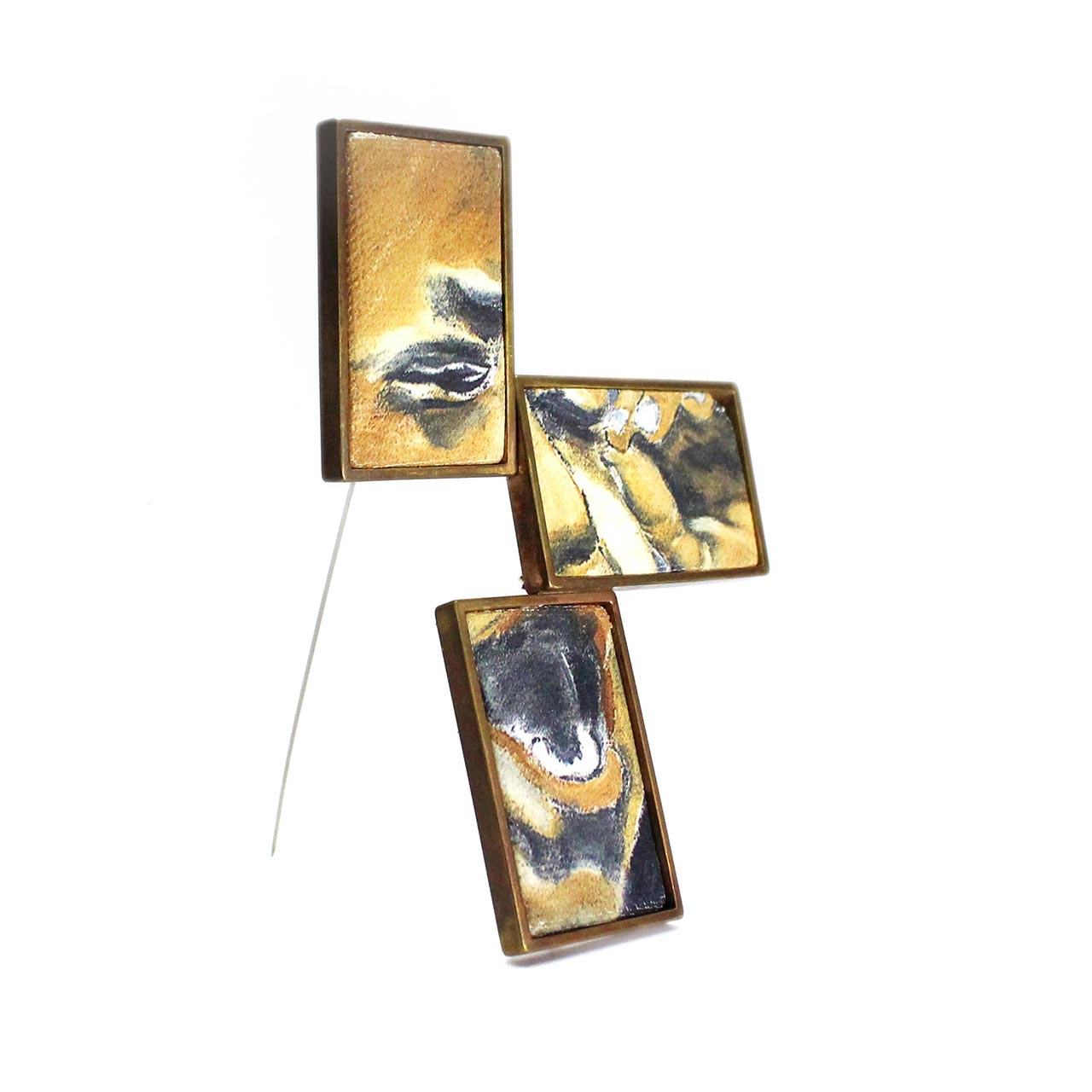 עומרי: כן. רוב העבודות הן תכשיטים עשויים כסף, פליז עם פטינה, פליז מצופה זהב, קנבס מודפס. הטכניקה משתנה מסדרה לסדרה. יש אוביקטים שרוטים, שבהם לקחתי שכבה של קנבס מודפס, חיברתי לשכבת פליז עבה ושוב לקנבס, כופפתי אותם בחימום ואז התחלתי לשייף ולפצוע את הקנבס והמתכת – מה שיוצר תגליות חומריות קטנות של כל השכבות. בעבודות אחרות אני לוקח את הציור וצורב אותו בהדפסה פוטוכימית לתוך המתכת, ואז צובע מחדש עם אבקות צבעים ויוצק לתוך החורים/התבליטים שנוצרו