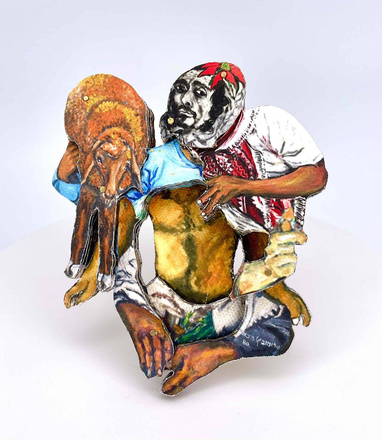 הפעם אני לא רק מציג את עבודותיו בתוך ״מסגרות״ שבאמצעותן אני מרכיב איזושהי הרמוניה בינינו, אלא מתערב לו בתכני הציורים. אני לוקח את האמנות שלו למקום ולשפה שלי. אני יוצר מתוך חלקי ציורים שלו קולאז׳ים דו ותלת־ממדיים שבהם אני לפעמים נוגע בנושאים שנחשבו בעיניו כאסורים.