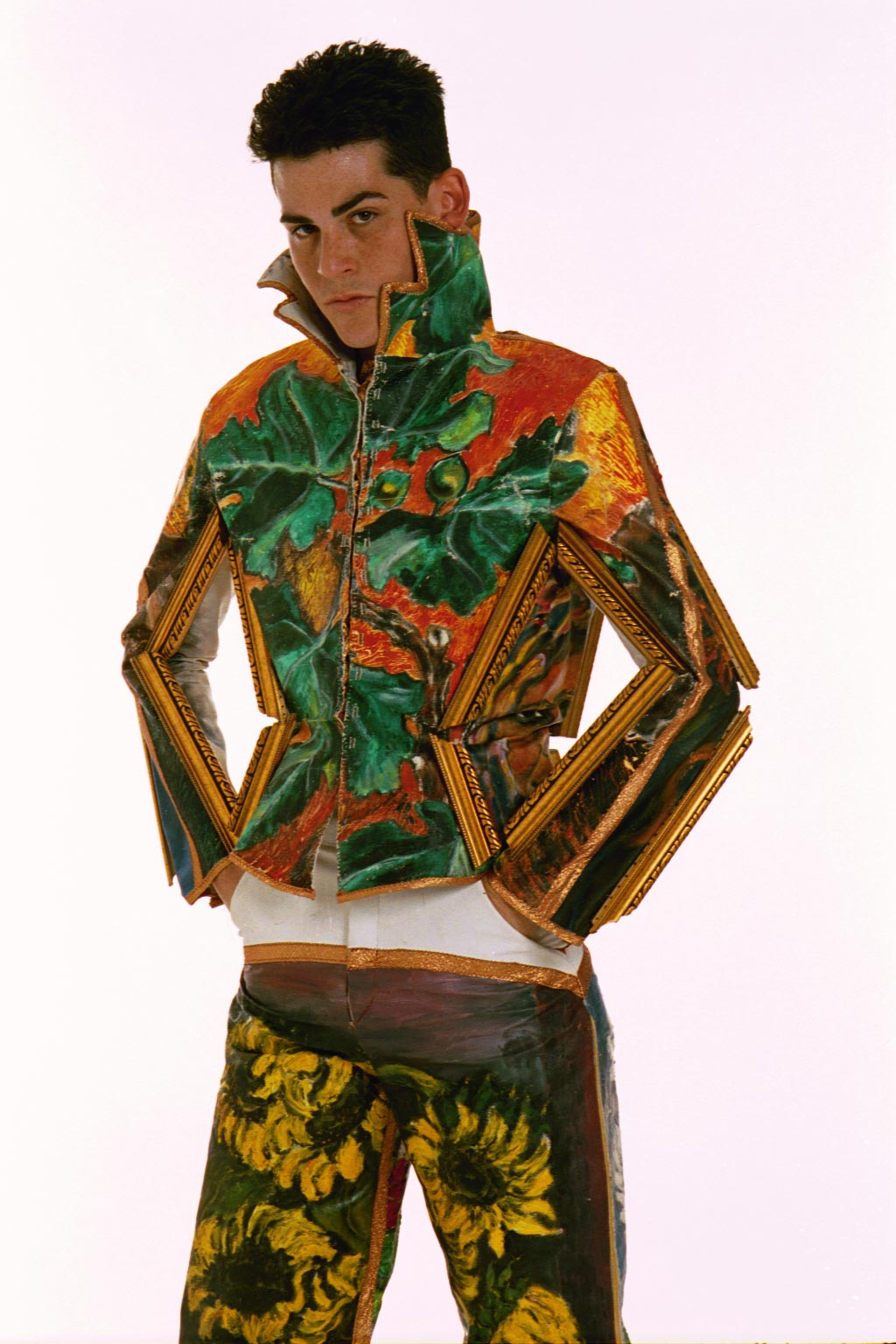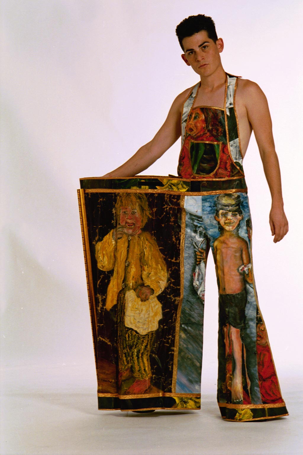 עומרי: רק פעם אחת פירקתי. בשנת 2003 בשנה ג׳ בבצלאל. לקחתי 30 ציורים שלו ומסגרות מהקיר, פירקתי אותם ויצרתי חמש מערכות לבוש. מאז התבגרתי 🙂 אז היה לי חשוב הסיפור האותנטי, הכאב, המורכבות שהייתה שם לצד ההכרה שהוא לא זכה לה – מה שהוביל אותי להרוס ולשדרג את הציורים המקוריים