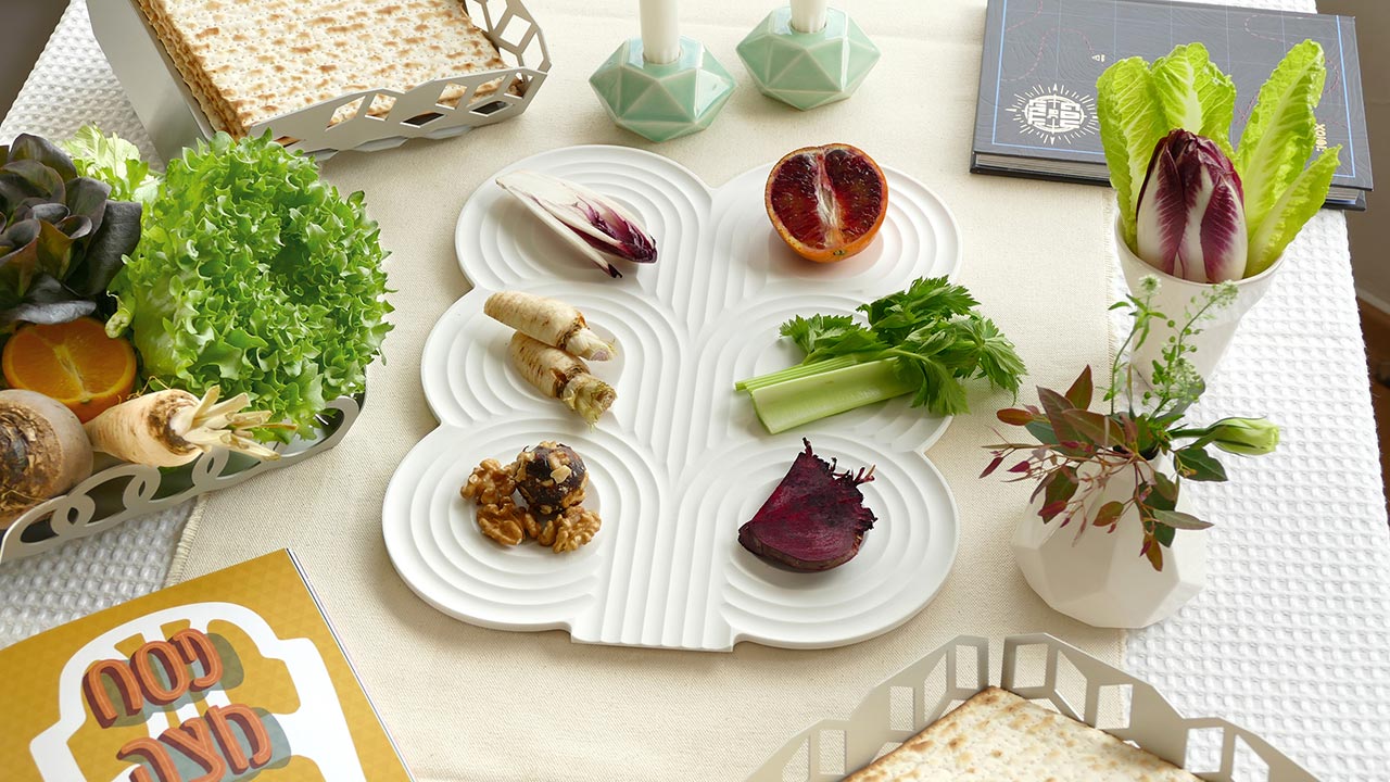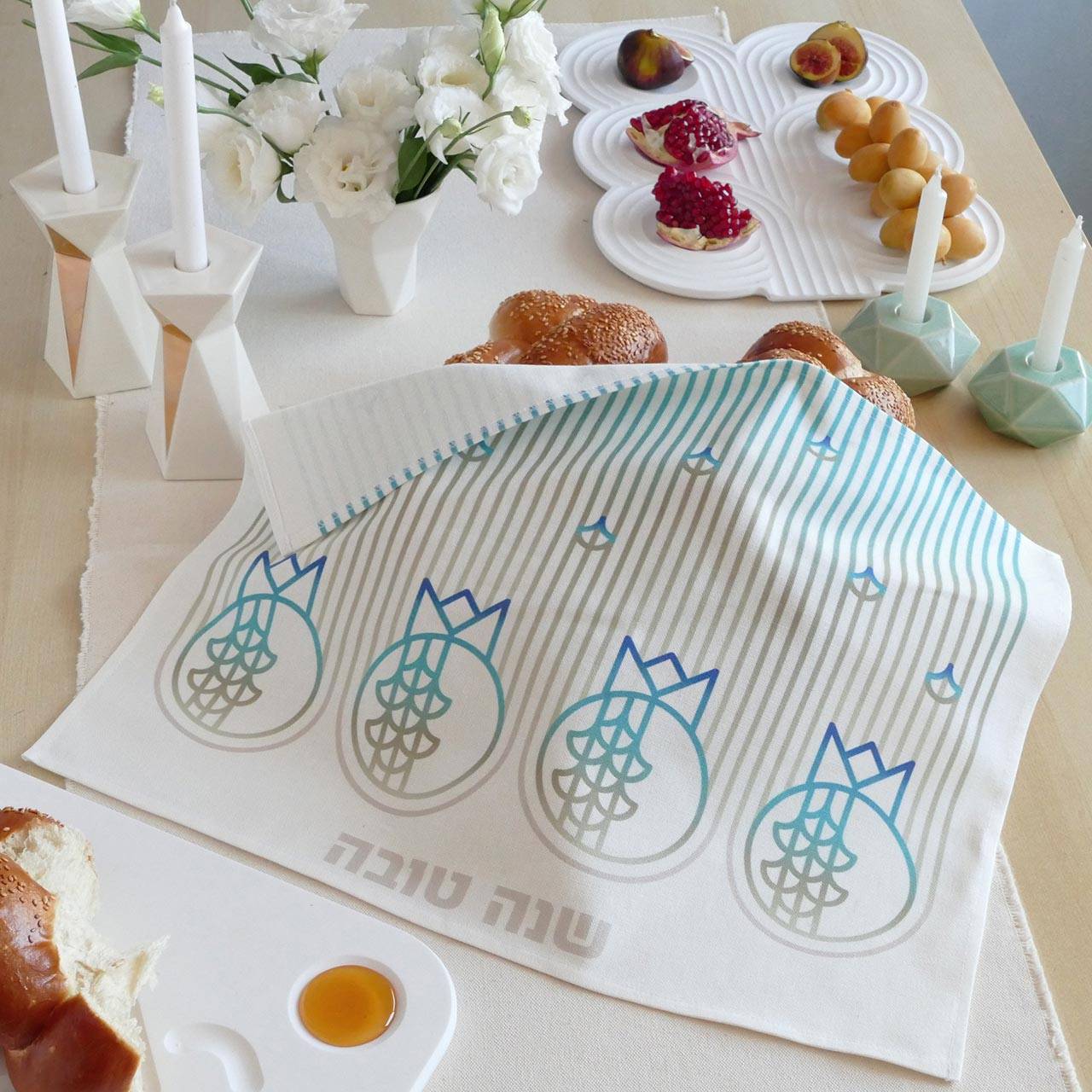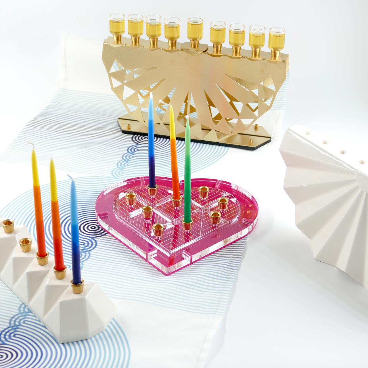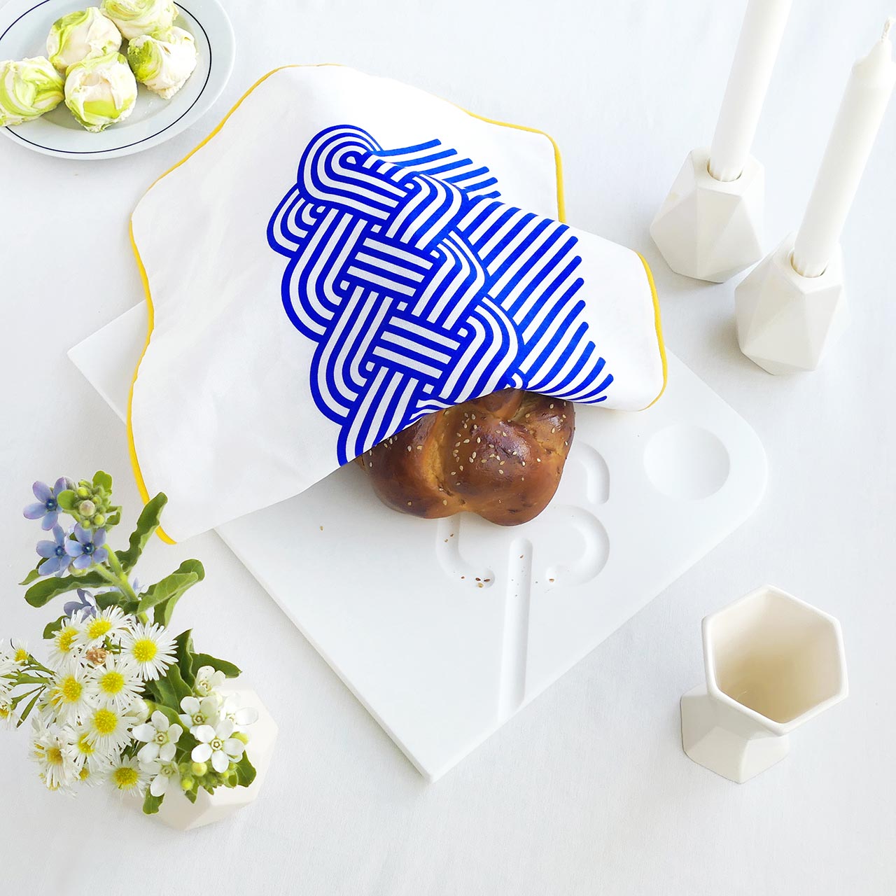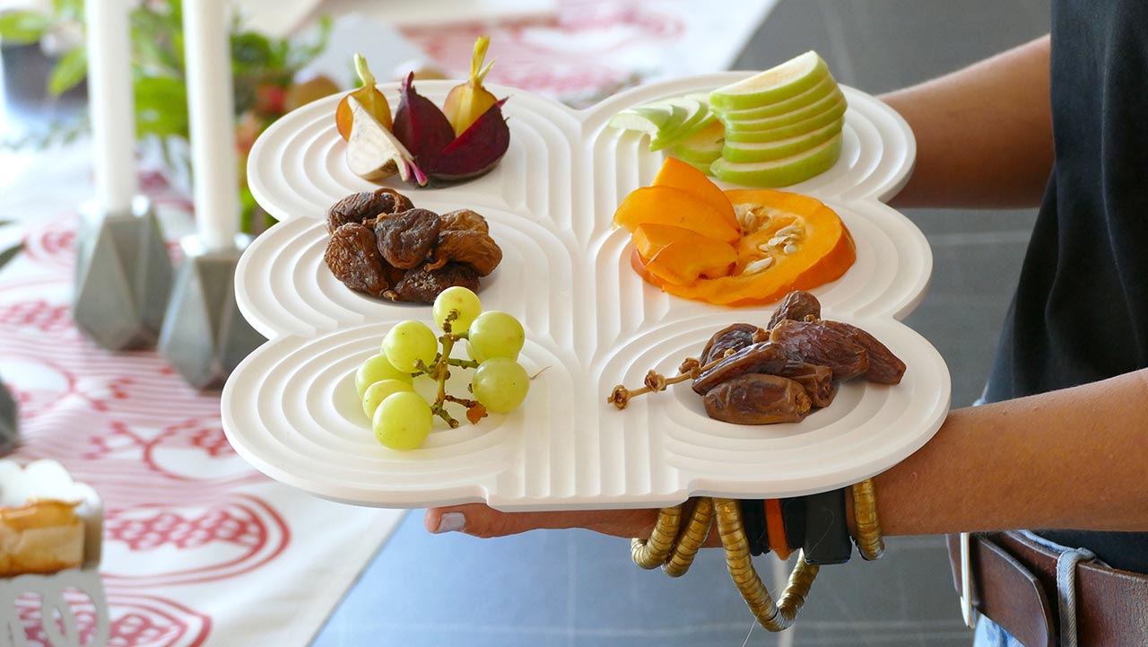 ״היו לנו גם חנוכיות וצלחות סדר גאומטריות בהשראת חידות הטנגרם. זה מתחבר לשנים המאוד ראשונות של הסטודיו – עיצבנו אז מיצגים ומשחקים עבור תערוכות מדעיות לילדים, שאבנו הרבה השראה ממוזאוני מדע. תהליך צביעת השיבורי – שאנחנו עושות בסטודיו – גם מזכיר לנו ערכת ניסוי מדעית חוייתית – מכניסות בד מקופל לדלי צבע אינדיגו – ומצפות להפתעות״.