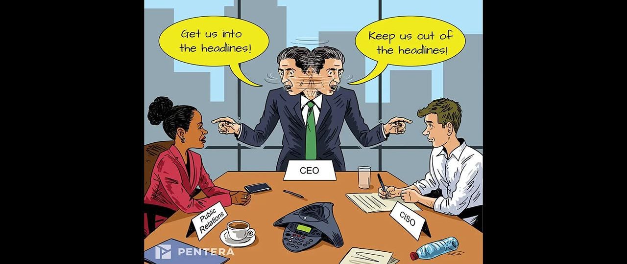 יש גם קריקטורה שמתארת מנכ״ל של חברה יושב בראש שולחן הישיבות, כשמצד ימין שלו יושב אחראי אבטחת המידע, ומצד שמאל יושבת אשת יחסי הציבור. על הימני הוא צועק ״תשאיר אותי מחוץ לכותרות״, על השמאלית הוא צועק ״תכניסי אותי לכותרות״. זו קריקטורה שכל אדם יכול להבין, כי כל חברה מעדיפה להימנע מתקיפת סייבר, ובטח מפרסום התקיפה שפוגעת באמינותה, ואנשי יחסי הציבור אחראים להכניס את החברה לכותרות בהקשרים חיוביים