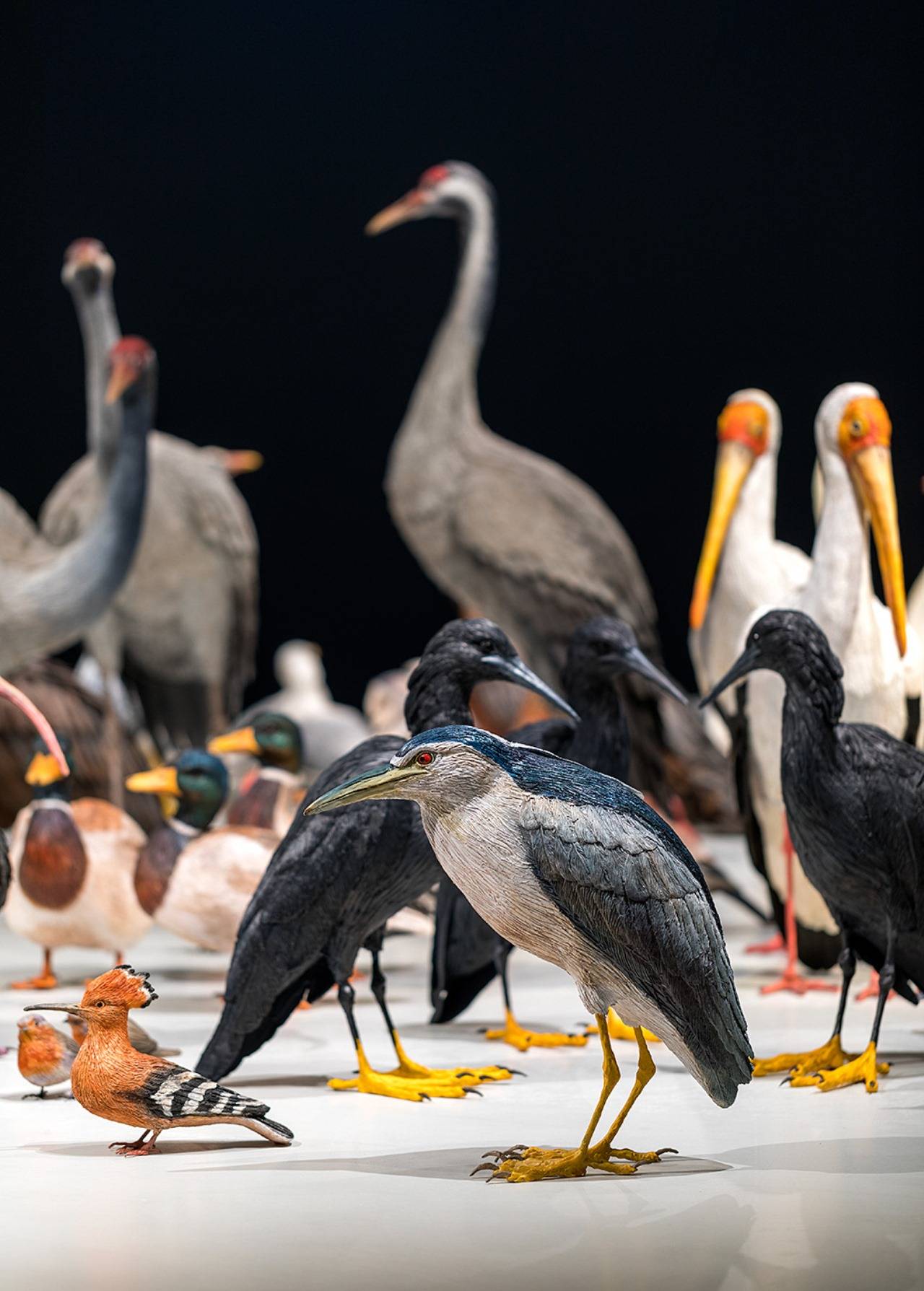 יותר מ־400 פסלי ציפורים מזנים שונים, מפוסלות בשעווה, נאמנות לגודלן ולמראה האמיתי שלהן, עומדות דומם על רצפת הגלריה כאילו קפאו בזמן. מדרורים ועורבים פשוטים ועד לציפורים מרהיבות וגדולות ממדים כמו פלמינגו ונשר. כל אחת מהן פוסלה ונצבעה בעבודת יד, בתשומת לב קפדנית לכל נוצה ונוצה.