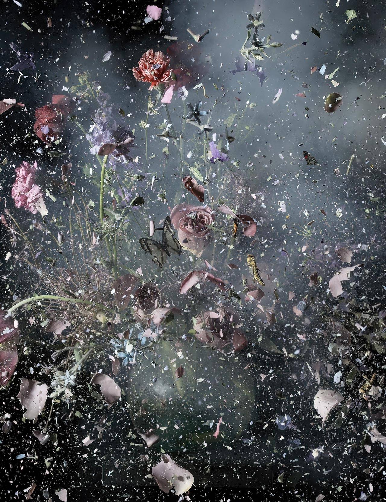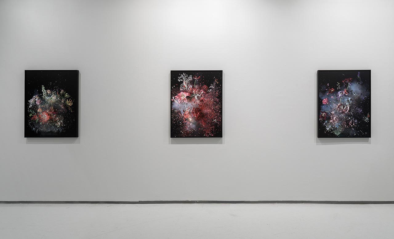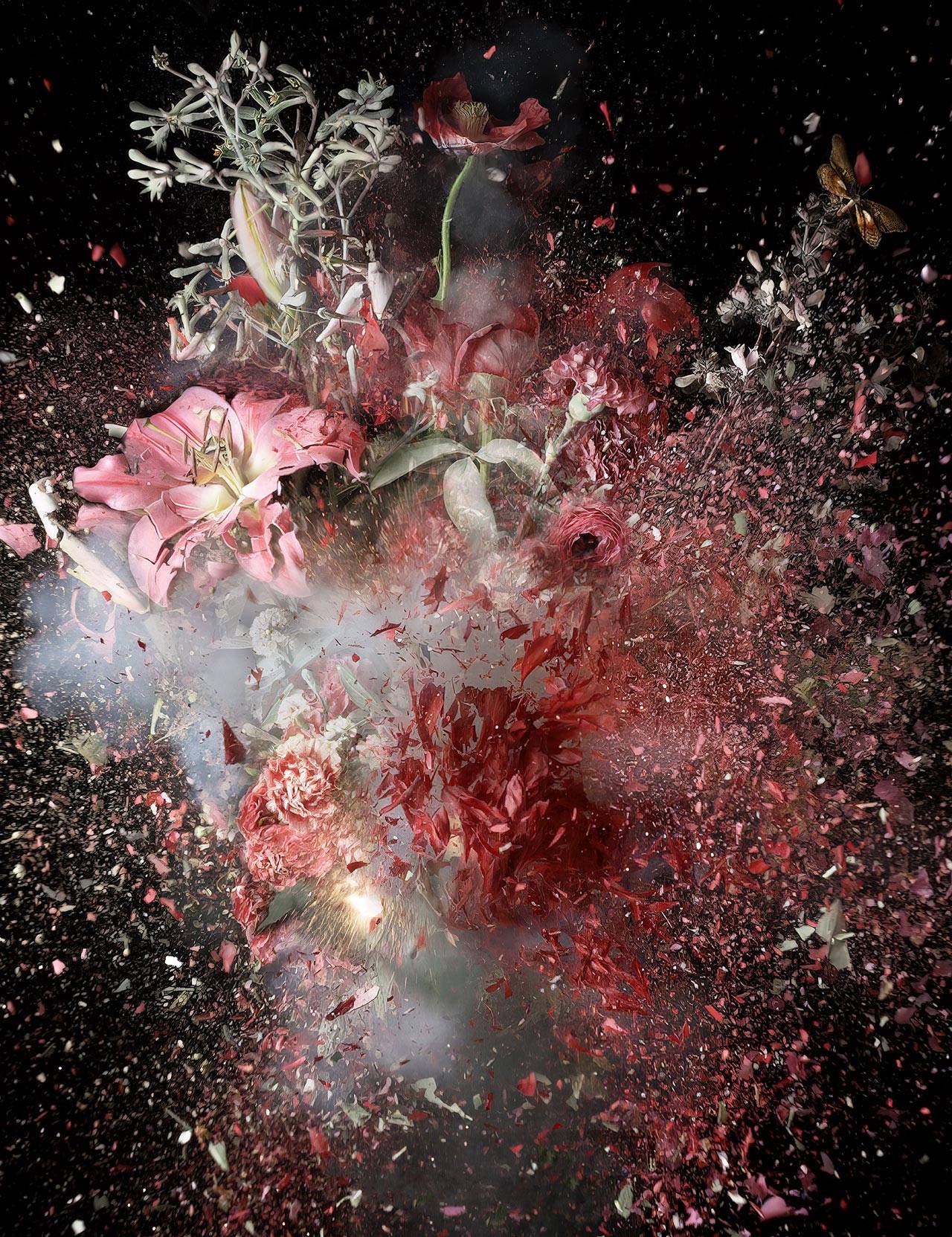 צילומי זרי הפרחים המתפוצצים הובילו אותו ליצירת הסדרה שמוצגת עכשיו בתל אביב: ״אחד הדברים שמעניינים אותי היא ההשפעה שיש לטכנולוגיה – קודם כל על התפיסה של המציאות – ואז גם על הייצוג שלה״, הוא מספר. ״אנחנו הרי מתווים את העמדה המוסרית שלנו ביחס להבנה שיש איזו אמת, משהו שאפשר לאחוז בו, שהוא קונקרטי. בכל העבודות שלי הרגע הזה הוא מאוד חמקמק. הדימוי שאנחנו רואים מתקיים ממש בשנייה של ההשתנות, ברגע שההווה נמצא במקום הכי דק שלו, בדיוק במעברים.