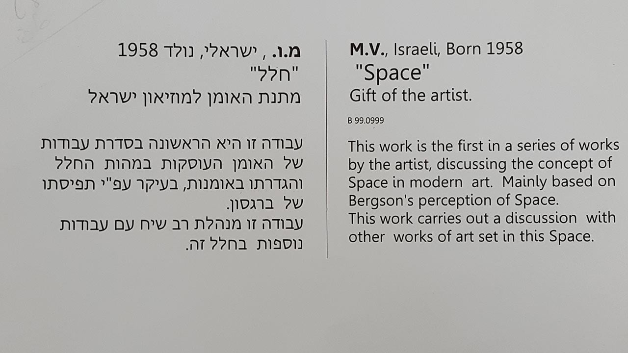 העבודה מתכתבת גם שתי עבודות אמנות נוספות – האחת של יוזף אלברס והשניה של לוציו פונטנה, המוצבות דרך קבע באותו אולם. העבודה היא ״רעיון״ (Concept) וייצוגה באולם היה באמצעות שלט שהכנתי, הזהה בצורתו לשלטים הנהוגים במוזיאון. השלט הוצב בפינת האולם כשהוא משקיף כזוג עיניים על חלל האולם, תכולתו וכל אשר מתרחש בו. השלט נשאר כשלושה שבועות על קיר המוזיאון עד שהתגלה והוסר. ״חלל״ מתייחס ל״זכרונו״ של אותו האולם – לכל מה שהתרחש ונוכח בו מאז פתיחתו בשנת 1965 עד זמן הווה וקדימה אל העתיד.