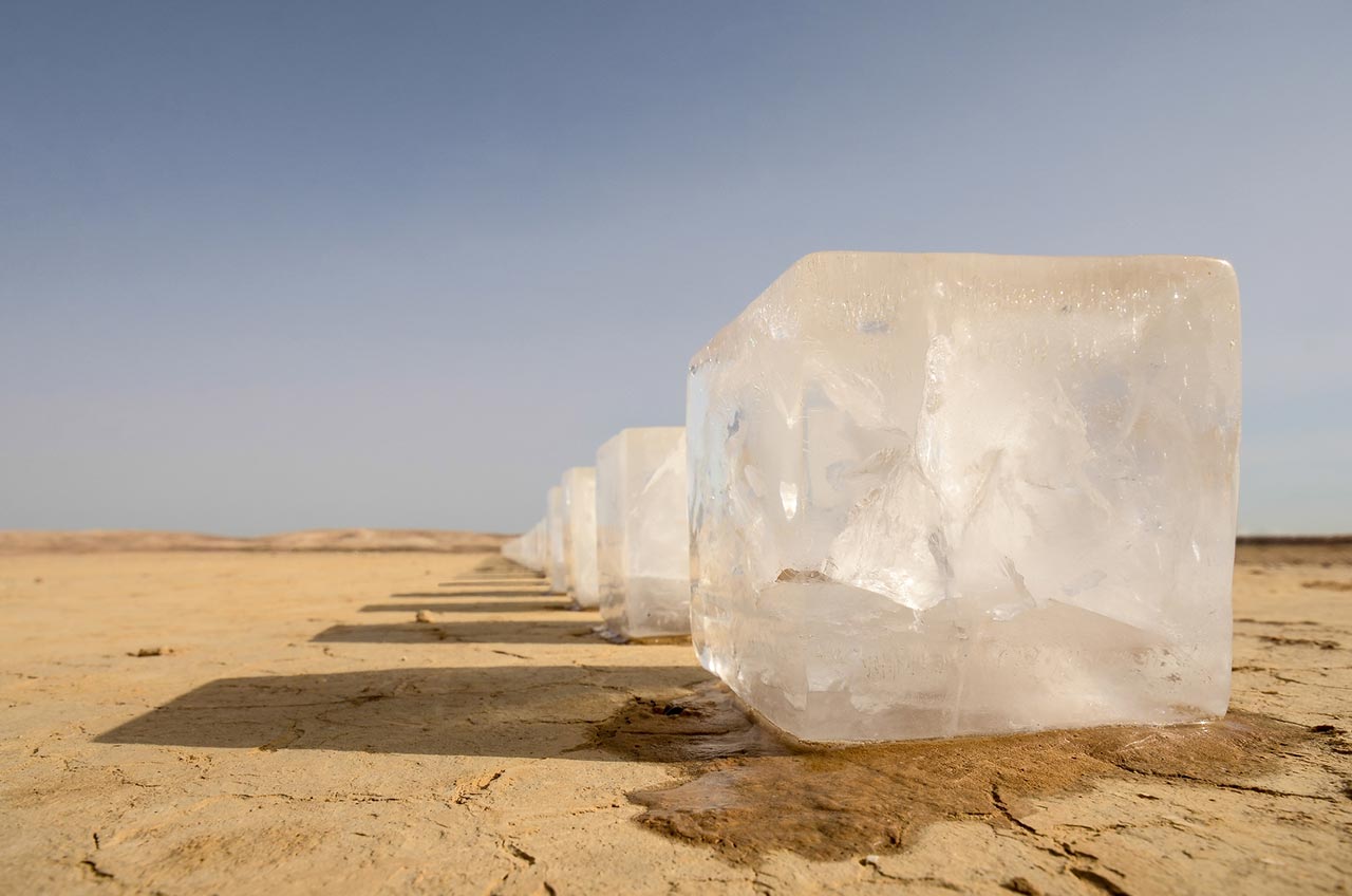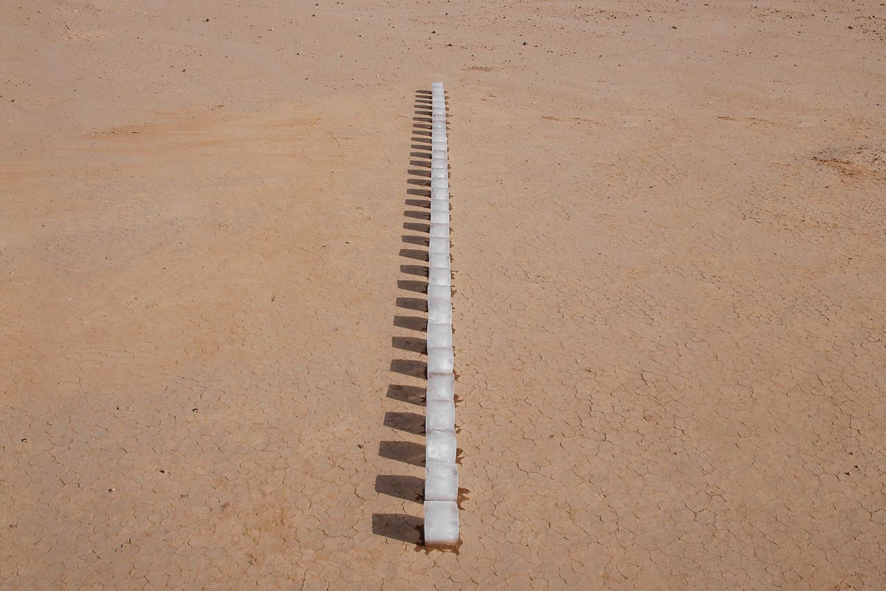 קוביות החומר עשויות מקרח ומוצבות במדבר ביום קיץ חם. תהליך ההפשרה מתועד באמצעות חמש מצלמות סטילס, מהאוויר ומהקרקע שמצלמות במרווחי זמן קבועים (טיים־לאפס). בתום תהליך ההפשרה מתקבלת שורה של 61 קוביות זהות: קוביית חלל, קוביית חלל, קוביית חלל…