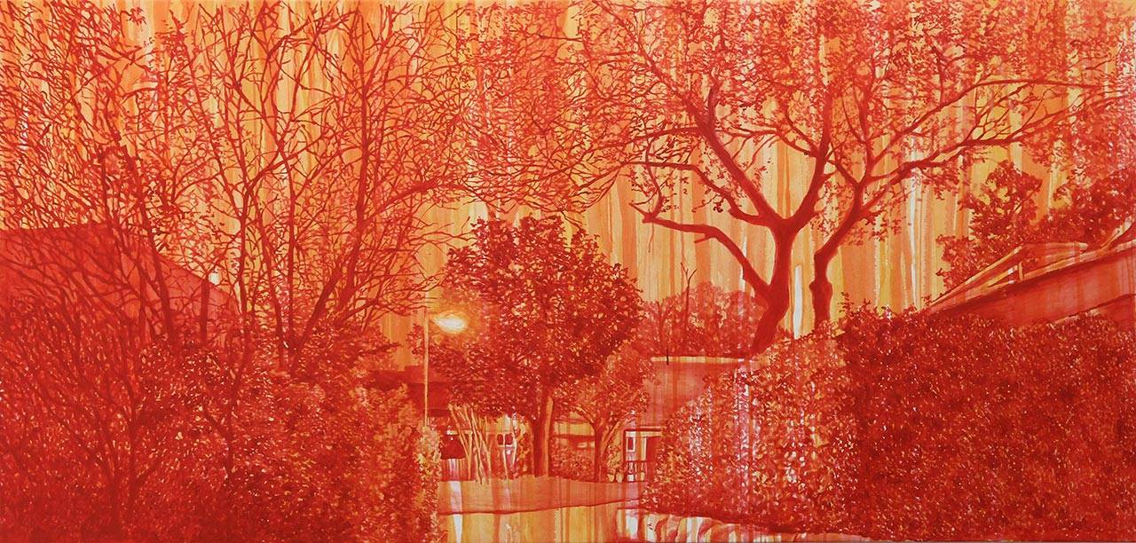 ״כך נולדה הסדרה, שכולה ציורי המקום, הקיבוץ, הבית והשכונה. אני צריכה רק לפתוח את דלת הסטודיו והמקום נפרש לפני, על בתיו, עציו ומדשאותיו, ואנשיו. ואינני מתעייפת לעולם מלהביט בו. אני עוסקת במקום, מפרקת ובונה אותו מחדש, מערבבת זיכרון ומציאות, עבר והווה, מתוך צילומי הארכיון, צילומי משפחה וצילומים מהפלאפון, ועסוקה בשאלה מה אנחנו זוכרים ומה אבד לנו, משוחזר ומומצא מחדש. הזיכרון הוא דינמי ואישי אך גם קולקטיבי ומצטבר. אני מנסה לפרום אותו, לקרב ולהרחיק, מנזילה עליו ושופכת צבע, מבהירה ומכהה, ובונה עולם סגור בועתי״.