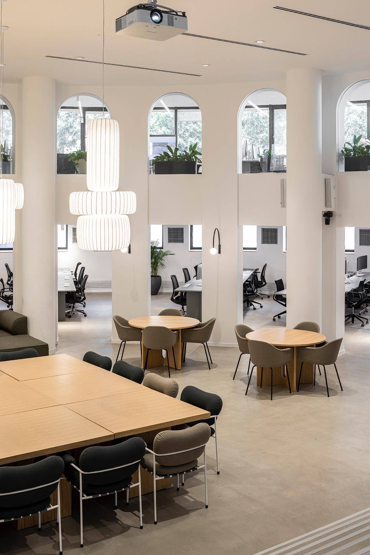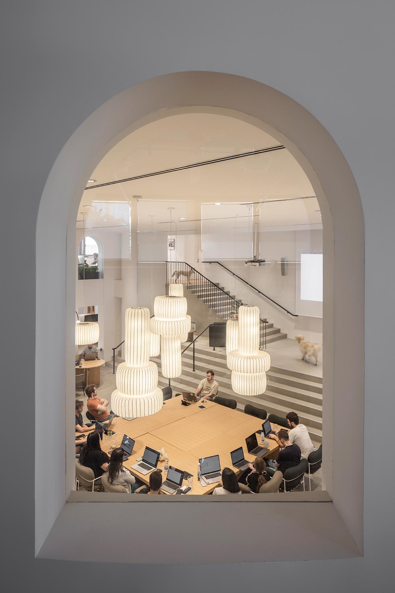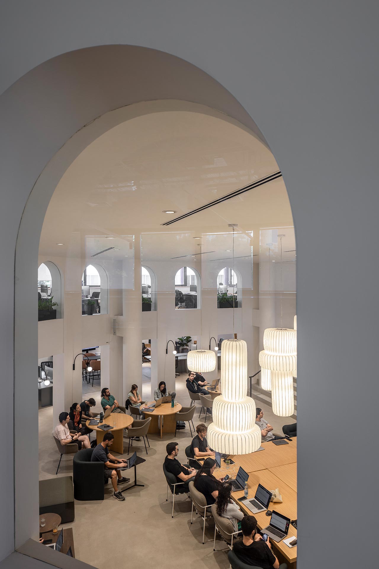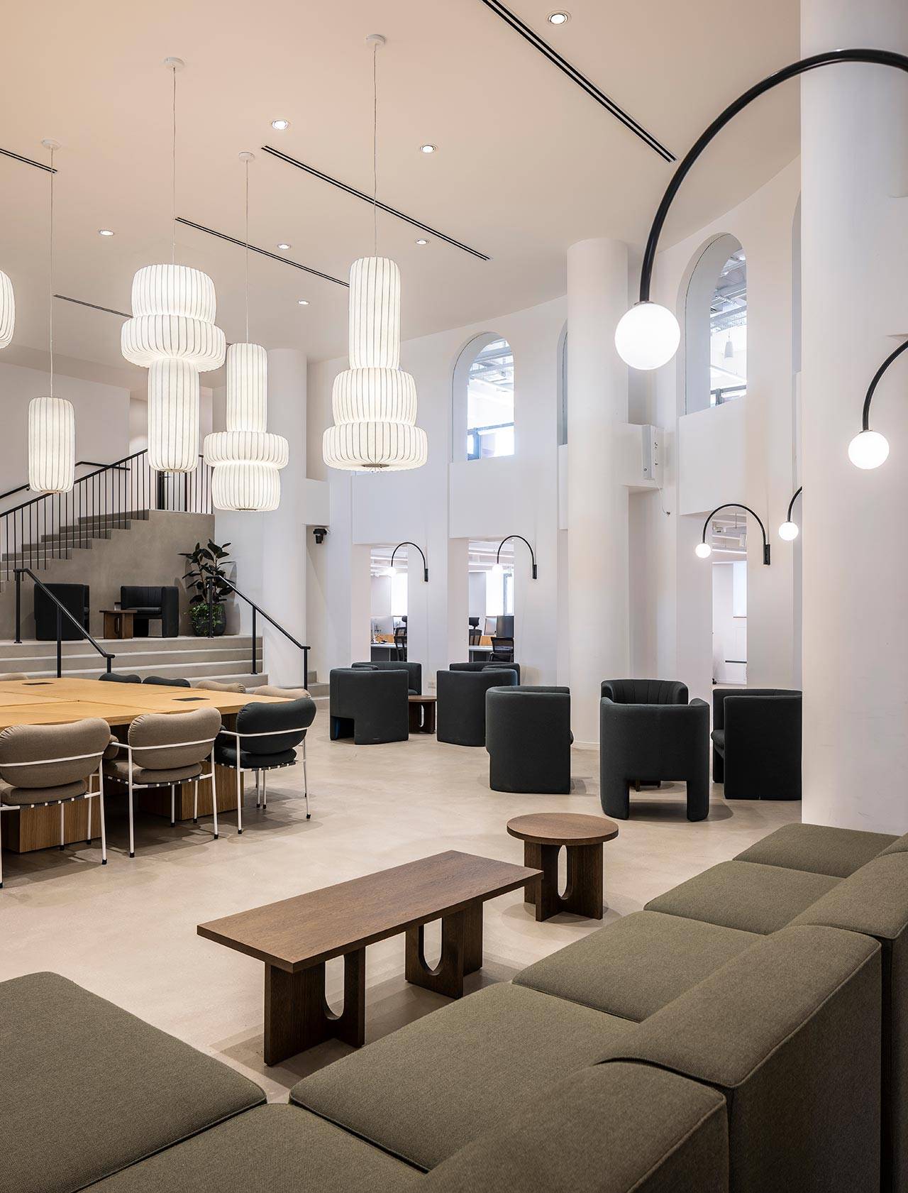 אל הגלריה העליונה מובילות מדרגות המאזכרות את המערך המבני של המדרגות הספרדיות ברומא: שני גרמי מדרגות משני עברי המרחב, שנפגשים במעין במה, ממנה מוליכות מטה לאולם מספר מדרגות רחבות. ״ההשראה שלנו לתכנון המדרגות הגיעה מהמדרגות הרומאיות, כמו גם מהמבנה של אמפיתיאטרון קלאסי. הכוונה הייתה לייצר סוג של פיאצה, מקום שמזמין התכנסות ושיתופיות״, מסבירים אדריכלי נורם. הגלריה העליונה תחומה במערך של קשתות המהדהד את המוטיב המעוגל של מעטפת הבניין, ומחלליה המשמשים כאזורי עבודה אפשר להשקיף מטה אל מרכז האולם, כמו גם אל החוץ.