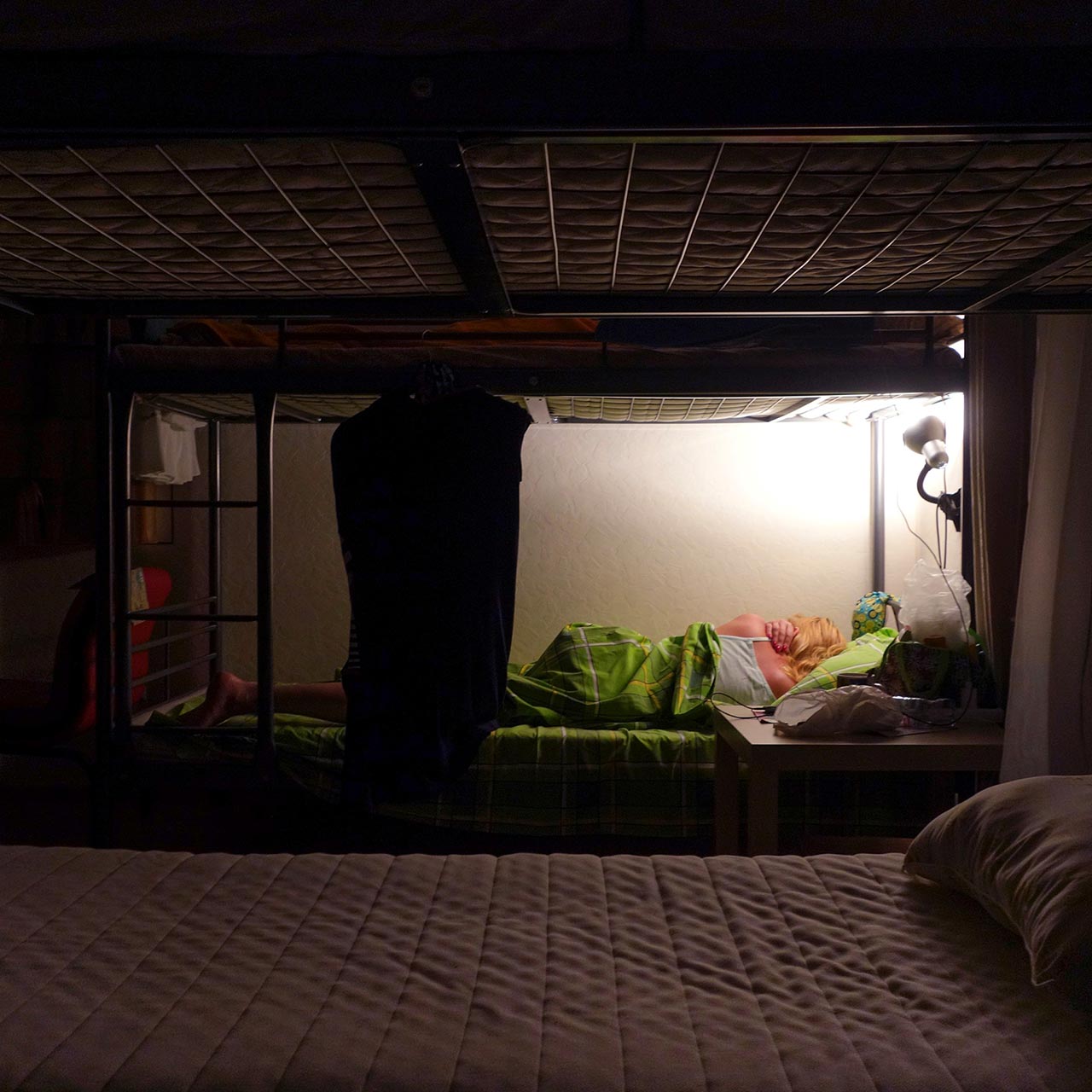 בתערוכה דיירים על מיטה סתורה, בודדים או בחברה, עייפים או שיכורים מחופש – את כולם צילמה אי שם במעונות ובהוסטלים המבקשים להיות בתים לרגע עבור אלה המתארחים בהם. שם, מתערבבים תרבויות ומנהגים ונוצרות אסתטיקות יומיום חדשות. בנוסף מוצגים גם הדפסים צילומיים שיצרה לבנת במיוחד לקראת התערוכה בסדנת ההדפס באורנים.