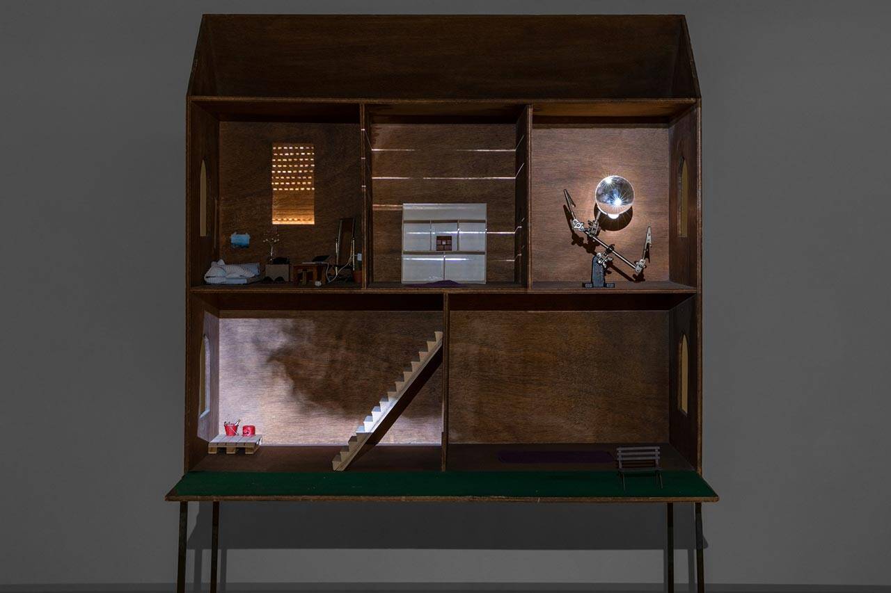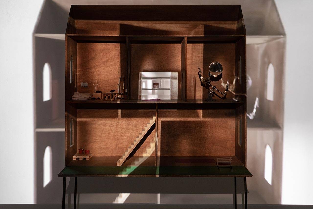 במקרה הזה בתוך בית הבובות נמצא מודל מוקטן של בית הבובות המתפקד כבית בתוך בית. אני משתמשת בארכיטקטורה של בית הבובות, ומקבילה בינו לבין הבית שבו ממוקמת העבודה, בית ליטבינובסקי, כך שאני יוצרת בית בתוך בית בתוך בית.