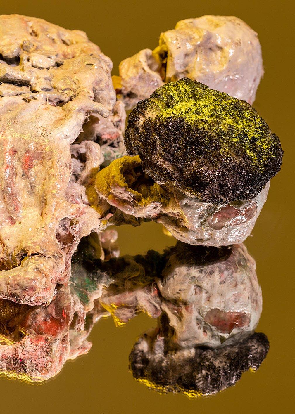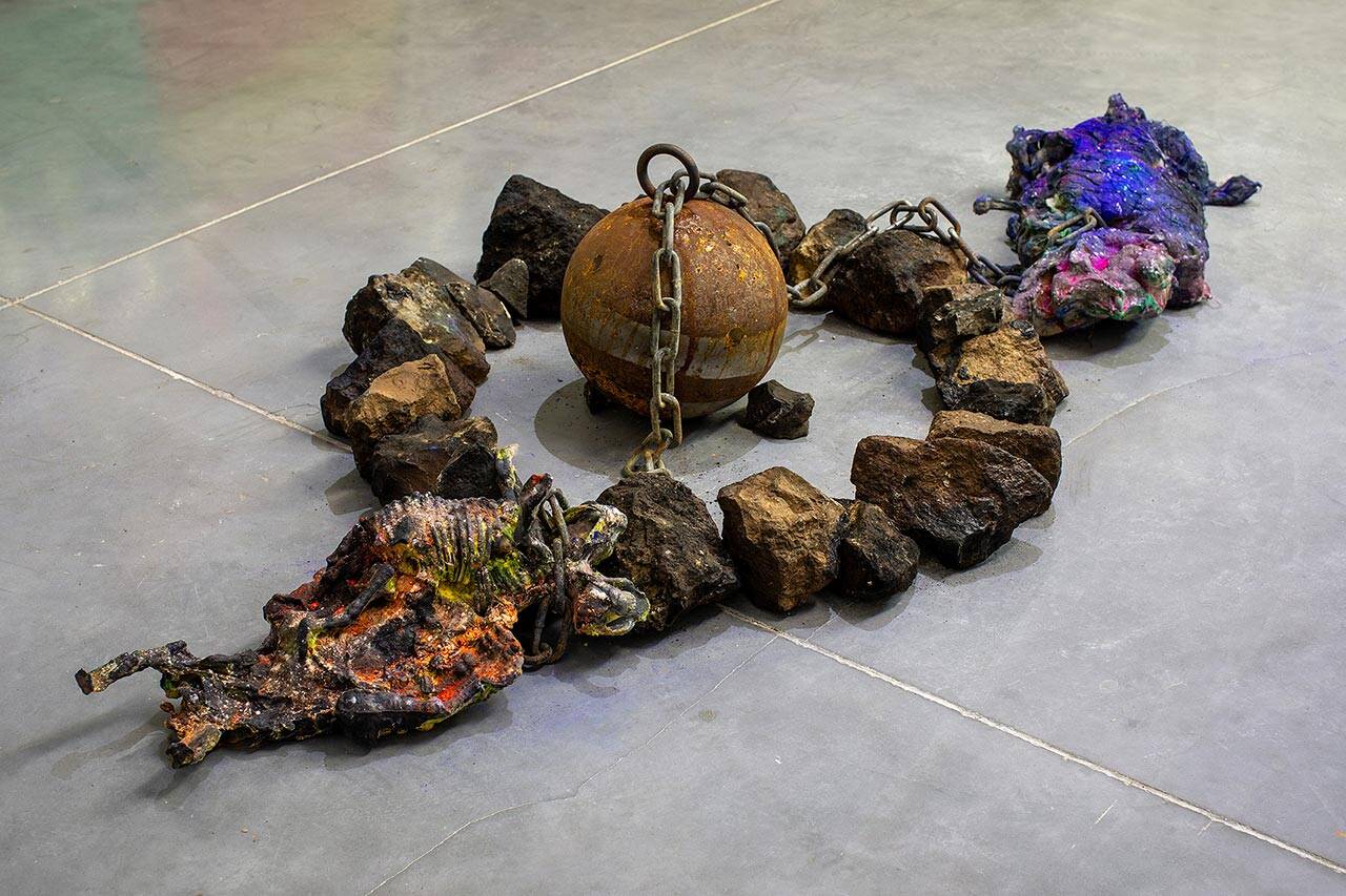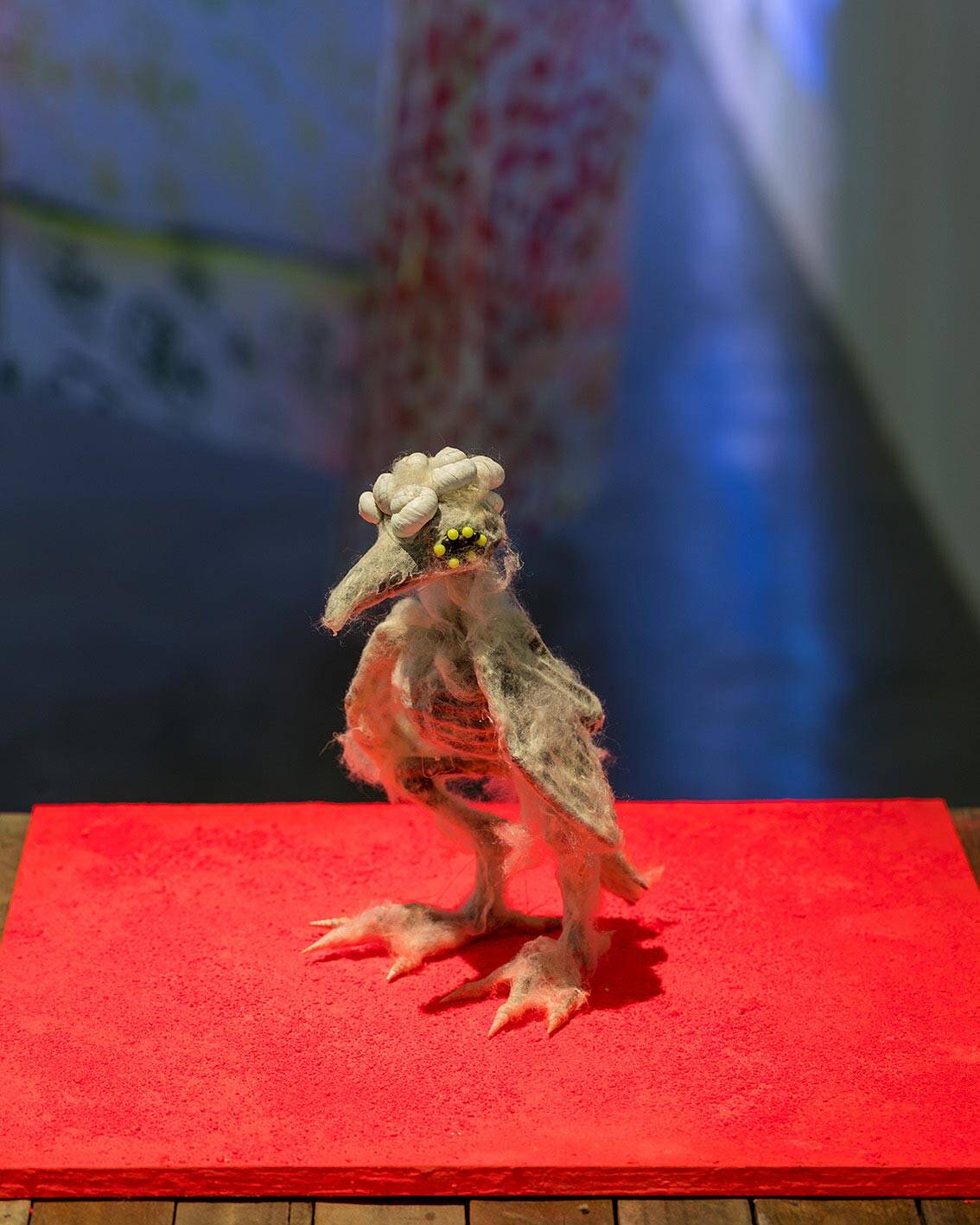 ויש גם שלד ציפור עם חלזונות על הראש, ומדורות פגרים של כלבים, ודימוי של אבי כעורב לבן, ועוד הרבה פרטים בחלל התערוכה ובעבודת הווידיאו שבונים עולם שלם – מצד אחד כאוטי ומפחיד ומצד שני מגן ומנחם. על העולם הזה, שהיה הפקה כמעט קולנועית, עבד ספיר יחד עם אנשים נוספים שתרמו למערך – בין אם זה איתי מרום שצילם, הינדה וייס שערכה את עבודת הווידיאו או דרור שימן שיצר את הסאונד עבורה.