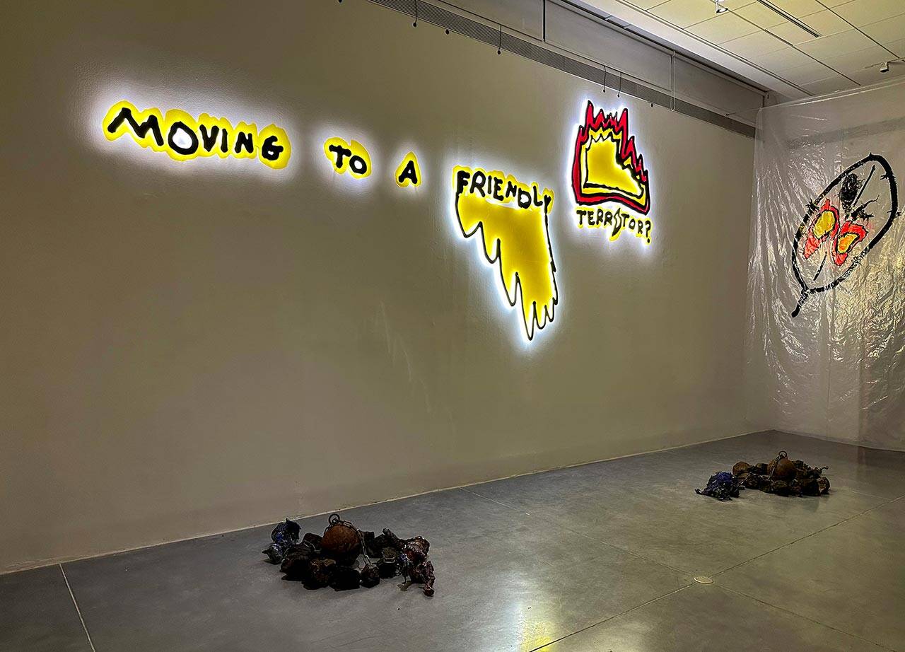 ״רציתי לייצר תחושה של כניסה למרחב ביתי, מגן, מחמם. בחוץ, במיוחד באזור של פסלי השלדים או מדורות פגרים שמוצבות על הרצפה לידם, גם התאורה היא קרה״. על הקיר מעליהם כתובת ניאון בסגנון קומיקס שבה כתוב Moving to a Friendly Territory – משפט ששמע ספיר מאדם שחלף על פניו ברחוב זמן שהלך יחד עם אבי. את הדימוי לכיתוב בקש ספיר מנמרוד בנו לכתוב איך שהוא רואה לנכון, ואז יצר ממנו עבודת ניאון שהיא הגדלה של אותו הדימוי המדויק, אחד לאחד״.