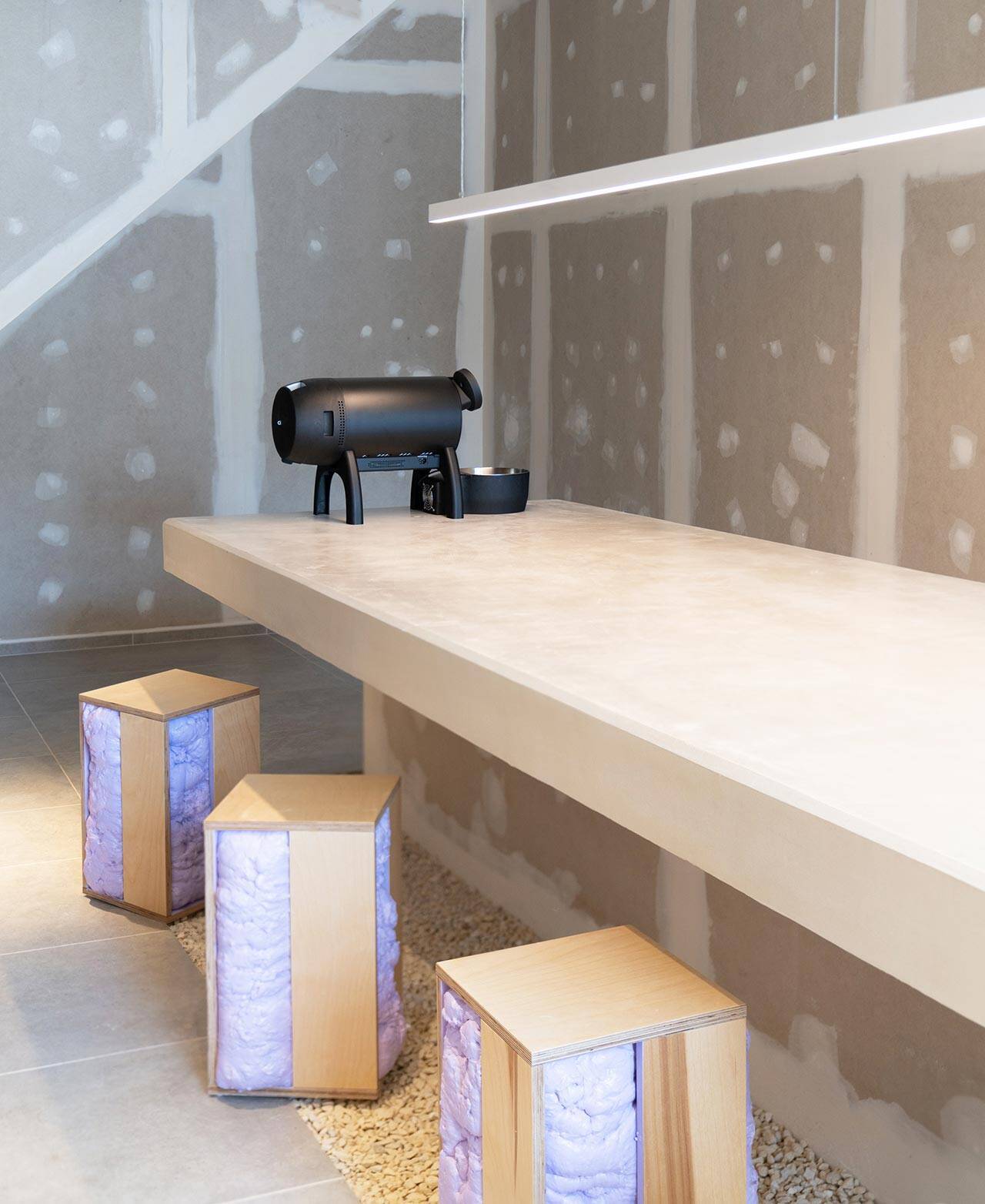 הרעיון היה להשתמש בחומרי גלם רדיקליים ובסיסיים שאינם מזוהים עם אסטתיקה בהכרח. כלומר, חומרים לא מעובדים כמו קירות גבס חשופים ולפני טיח – רצפת חצץ ומערכת כסאות עשויים מקצף פוליאריטן המשמש את ענף הבניה לבידוד. היישום של כל אותם חומרים מייצר חלל שמעלה שאלות לגבי הבחירות ומהות השימוש: האלמנט המרכזי בחלל הוא שולחן הבטון הגדול שסביבו מתקיימים כל השימושים, ואני חושב שזו עוד דרך לייצר נוכחות אחרת שמטיבה עם רעיונות שיווקיים עבור עסק דרך כלים אדריכליים