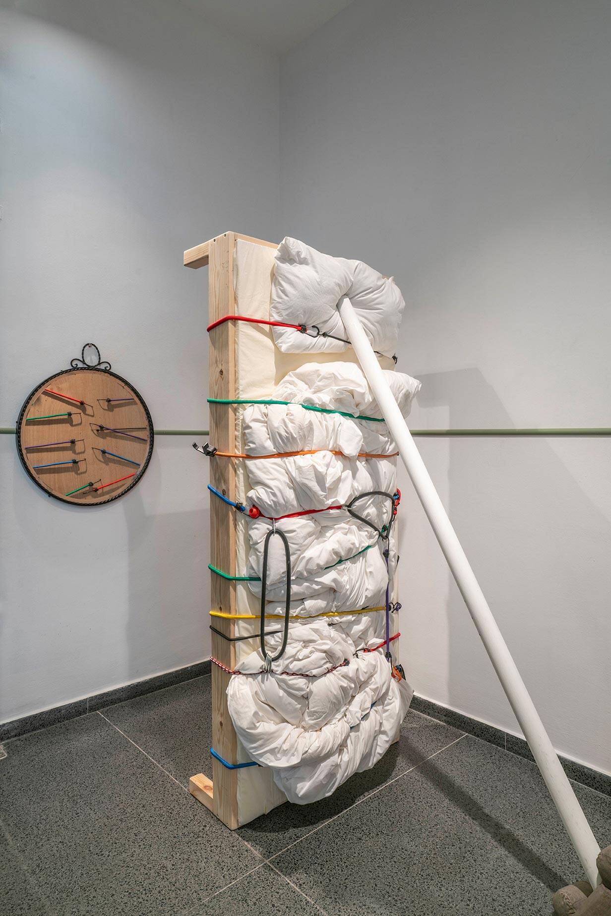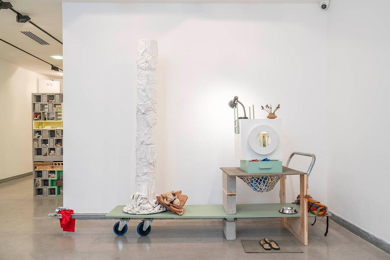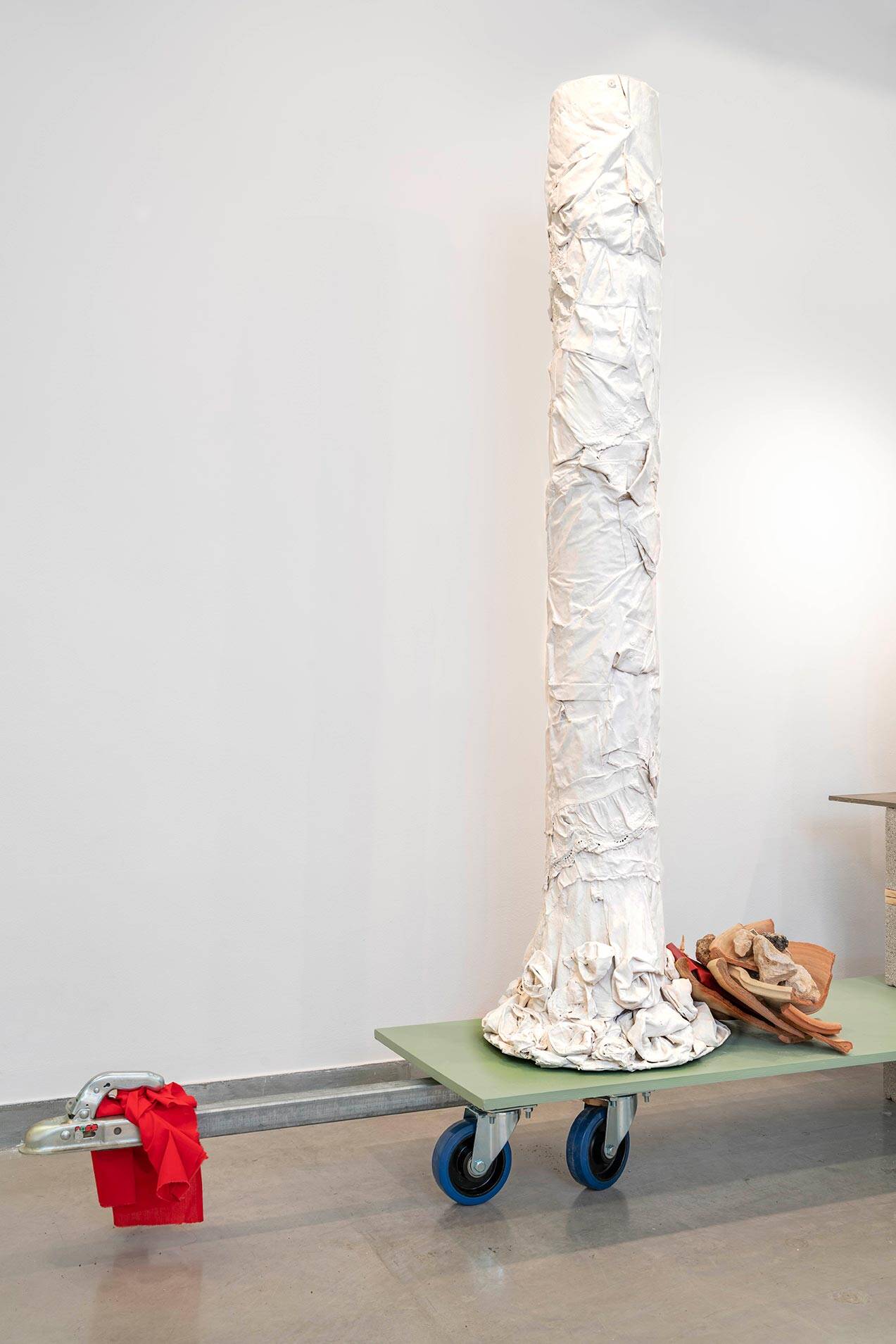 תמר: העמוד הוא יותר חידה עבורי. הוא חלק מעבודה שנקראת ״ערכת הישרדות״ שדמיינתי אותה כעגלה לא־החלטית להתפנות מהירה. ההגדרה הזו שלה נעשתה לצערי יותר רלוונטית עם ההתפתחויות בארץ של החודשיים האחרונים. ראיתי אותה כעגלה שעורמים עליה כמה דברים לפני עזיבה. היא לא־החלטית כי מצד אחד יש לה גלגלים וידית לדחיפה, אבל מצד שני היא נגררת, והגורר איננו. במסגרת זו דמיינתי את העמוד כעוד משהו שאוספים לפני עזיבה ומקפל בתוכו שוב אלמנטים של פנים וחוץ. הוא תזכורת לעמודים קלאסיים שנושאים גגות של בנינים אבל הוא עשוי בגדים שהם חפצים מאוד אישיים.