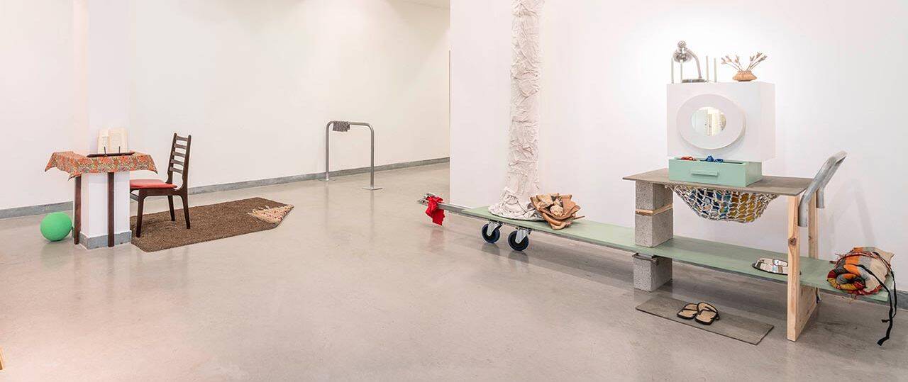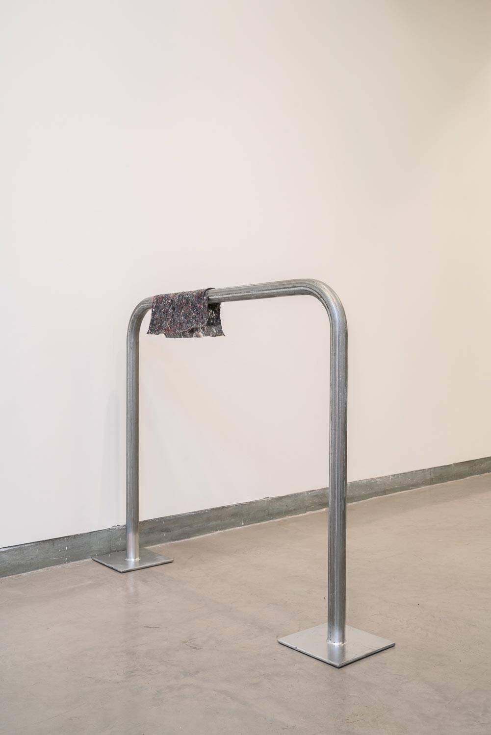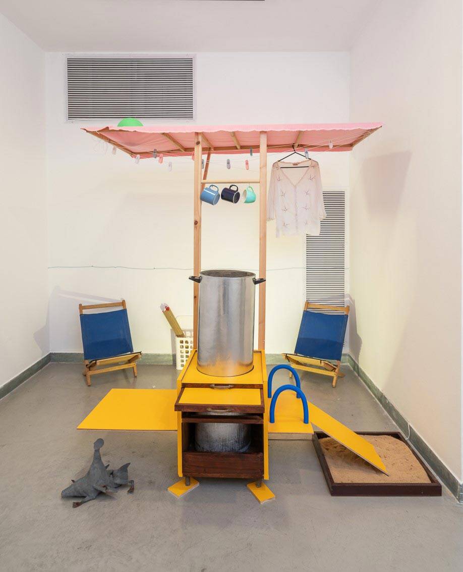 תמר: העמוד הוא יותר חידה עבורי. הוא חלק מעבודה שנקראת ״ערכת הישרדות״ שדמיינתי אותה כעגלה לא־החלטית להתפנות מהירה. ההגדרה הזו שלה נעשתה לצערי יותר רלוונטית עם ההתפתחויות בארץ של החודשיים האחרונים. ראיתי אותה כעגלה שעורמים עליה כמה דברים לפני עזיבה. היא לא־החלטית כי מצד אחד יש לה גלגלים וידית לדחיפה, אבל מצד שני היא נגררת, והגורר איננו. במסגרת זו דמיינתי את העמוד כעוד משהו שאוספים לפני עזיבה ומקפל בתוכו שוב אלמנטים של פנים וחוץ. הוא תזכורת לעמודים קלאסיים שנושאים גגות של בנינים אבל הוא עשוי בגדים שהם חפצים מאוד אישיים.