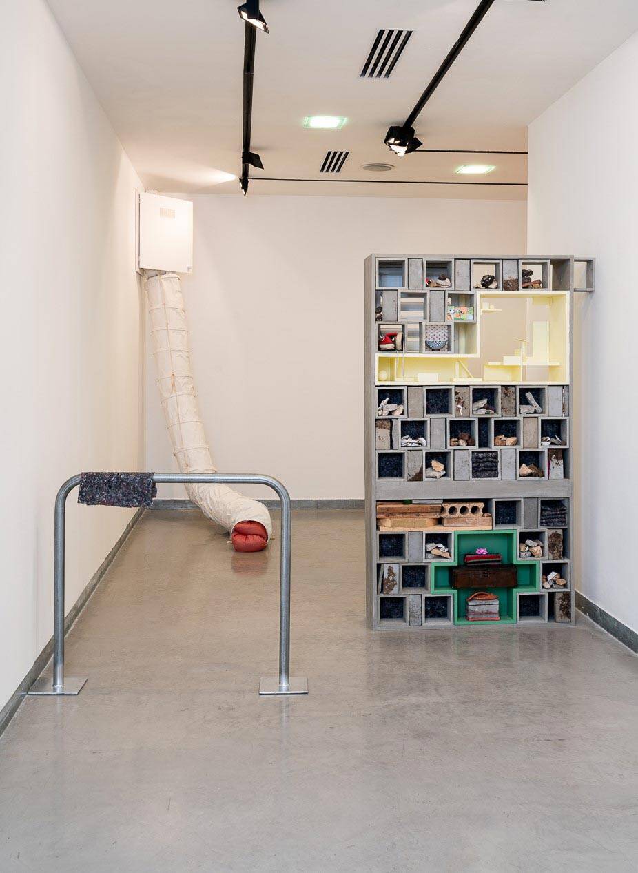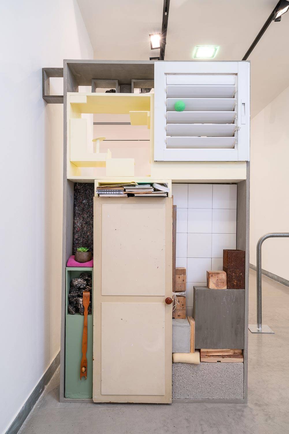 העבודה נפסקת רק כשצריך לשנע את העבודות לתערוכה. הזכרת בתחילת השיחה את ההומור בעבודות. אני באמת אומרת לעצמי לא פעם בסטודיו שאני מספרת לעצמי בדיחות. כנראה שלחלק מהן יש עקבות בעבודות. לעיתים, כמו בתערוכה הזו, קורה שהניסיונות החומריים שלי מוצאים מקום בעבודות או לפחות פותחים כיוון חומרי לעבודות עצמן. עוד דבר שמלווה כל עבודה שלי על מיצב הוא מודל תלת־ממדי של חלל הגלריה בקנה מידה. אני לא יכולה לעבוד בלעדיו