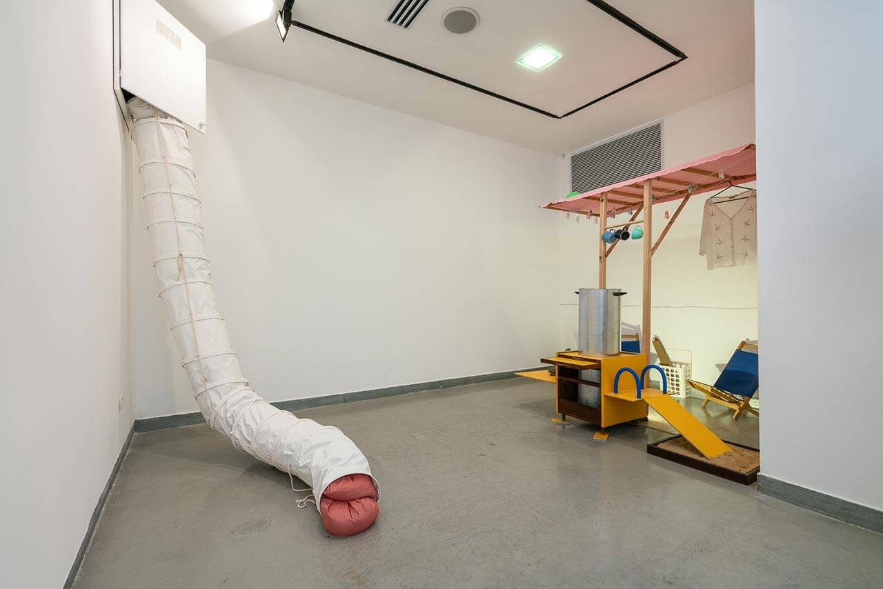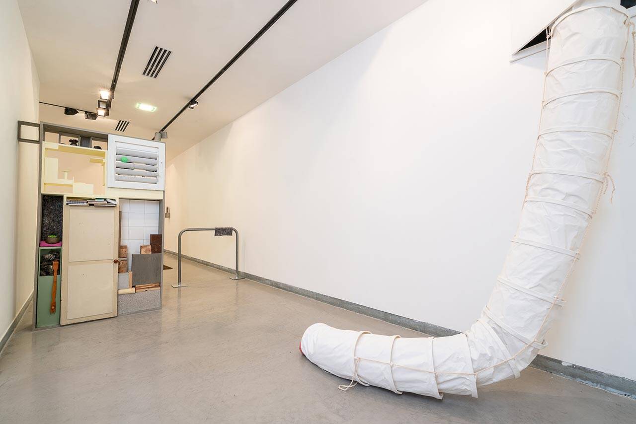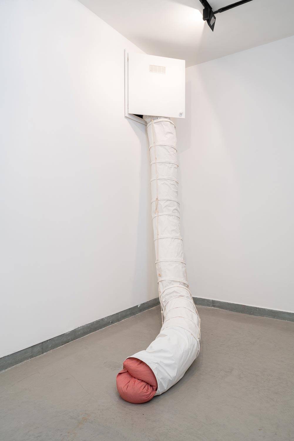 בתערוכה יש עבודה שנקראת ״שרוול פינוי אשפה״ שנעשתה בהשראת שרוולי פינוי האשפה שעשויים חוליות פלסטיק שמחוברות זו לזו בשרשרת ברזל, ומשמשים לפינוי תכולת בתים שנמצאים בשיפוץ אל תוך מכולה שנמצאת ברחוב. זהו אלמנט שנראה לי מתאים לקונספט של ערבוב פנים־חוץ. אלא שהעבודה שבתערוכה נעשתה מחומרים רכים יותר, תעשייתיים פחות (בד מוקשה). אני מרגישה שלחומרים יש מטען או מה שאני קוראת ״צליל״ וזה משמעותי לי