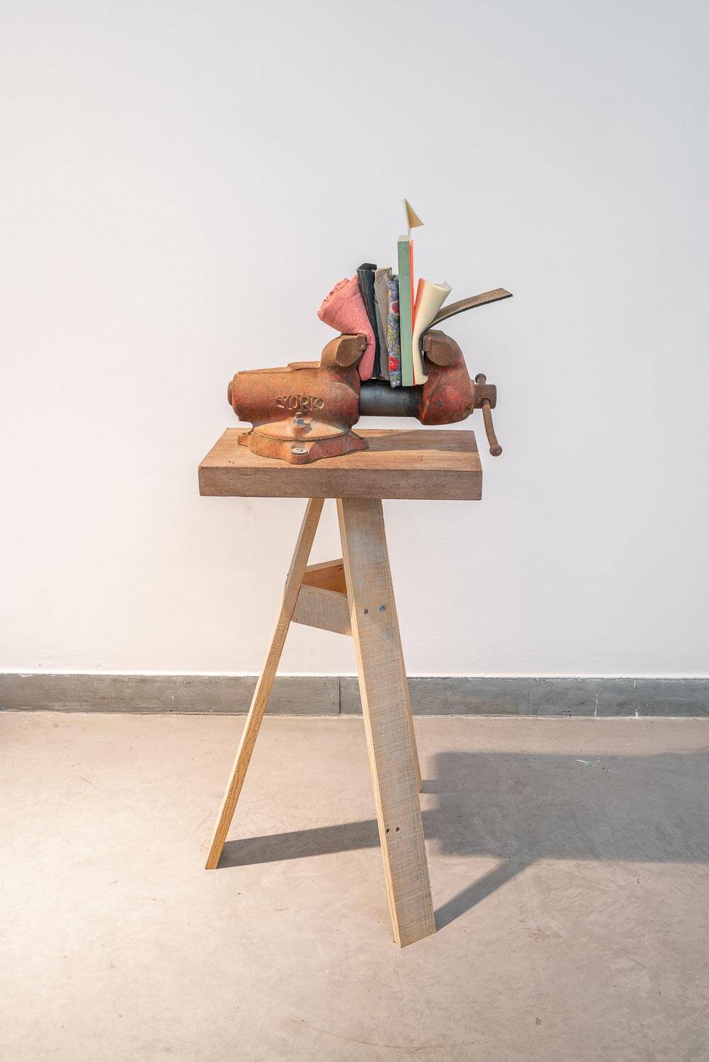 תמר: זהו, שאני באמת לא יודעת להסביר. אני תמיד משתמשת במילה ומרגישה שהיא מדויקת לי. ואני אפילו לא בן אדם עם רגישות מוזיקלית או ידע מוזיקלי. הרבה פעמים בתערוכות, לא רק שלי, אני מרגישה שנוצר בהן סוג של משפט מוזיקלי. אבל אין לי נימוקים. יש חומרים שמבחינתי נושאים צליל רך, וכאלה שנושאים צליל קשה, עצוב, חושני וכן הלאה. כשאני מחברת בין החומרים נוצר סוג של אקורד. לפעמים צורם, לפעמים לא. לא יודעת אם הבחנת בזה, אבל היה בתערוכה ספר שירים פתוח. ספרה של דבורה פוגל ״הנשמה שיש לחומרים״. זה זה