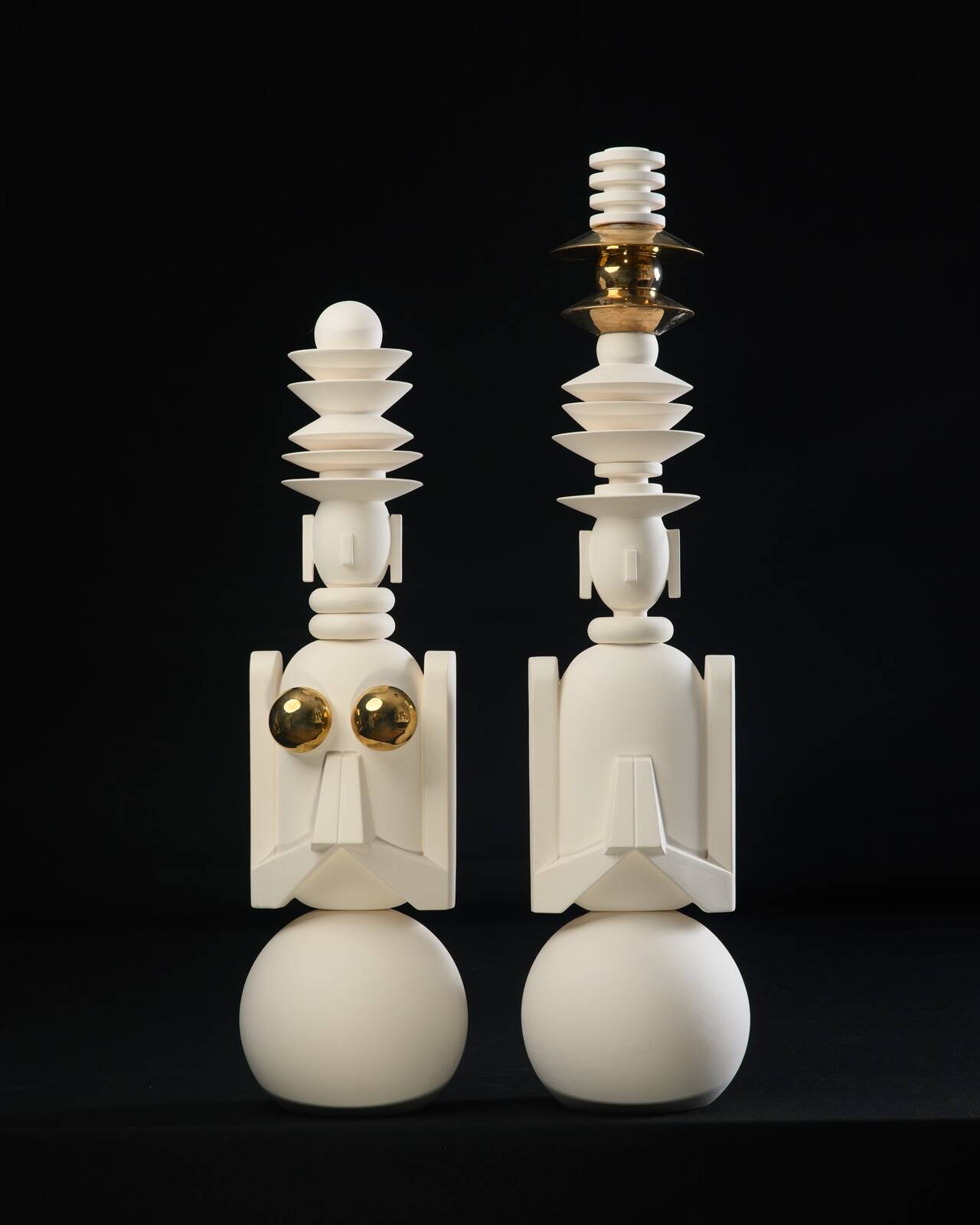הפסלים חוברים לקולקציה קוהרנטית, חלקה אבסטרקטי־גאומטרי ובחלקה יש רמזים לאנושי ולנשי – ראש, גוף, שדיים, זרועות בייצוג סימבולי. הטוטמים מגיעים לגובה שבין 60 ל־130 ס״מ, במנעד צבעוני מצומצם ועקבי, בעיקר לבן ושחור עם נגיעות מפתיעות של זהב, פה ושם צבעים ראשוניים עזים.