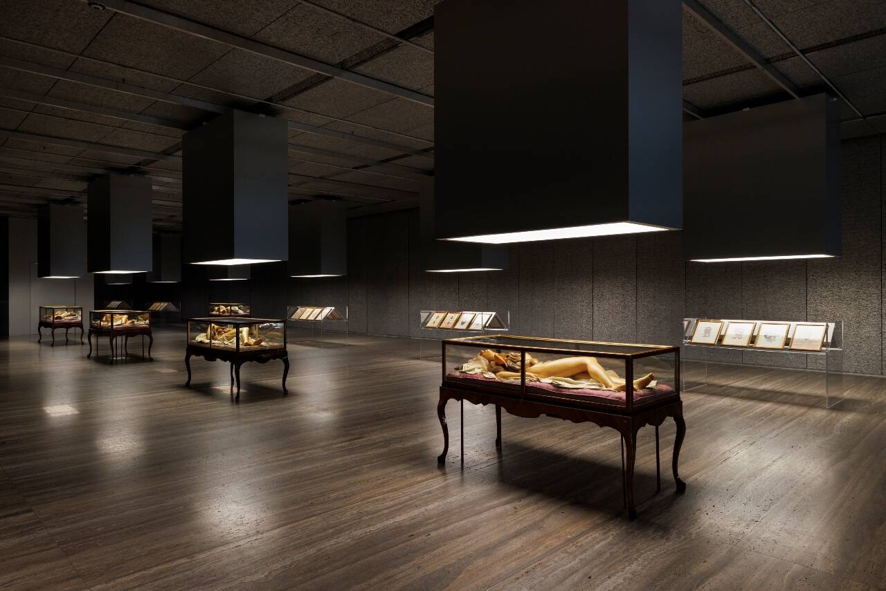 בפונדציונה פראדה המצב לא הרבה יותר טוב. פרט לשומרים, ויטרינות הזכוכית המקוריות של לה ספקולה מוקפות בסימוני אזהרה המונעים התקרבות, התאורה הנמוכה (ככל הנראה נועדה לשמור על המודלים העתיקים והרגישים) מקשה גם היא. נוסיף לכך את הרתיעה הטבעית מפני המראות החשופים והמזעזעים לעתים, ונקבל תערוכה שבה המבט מוטה על עבר המדעי, המנותק, והגוף החשוף על אבריו ועובריו נותר מנוכר ומבודד.