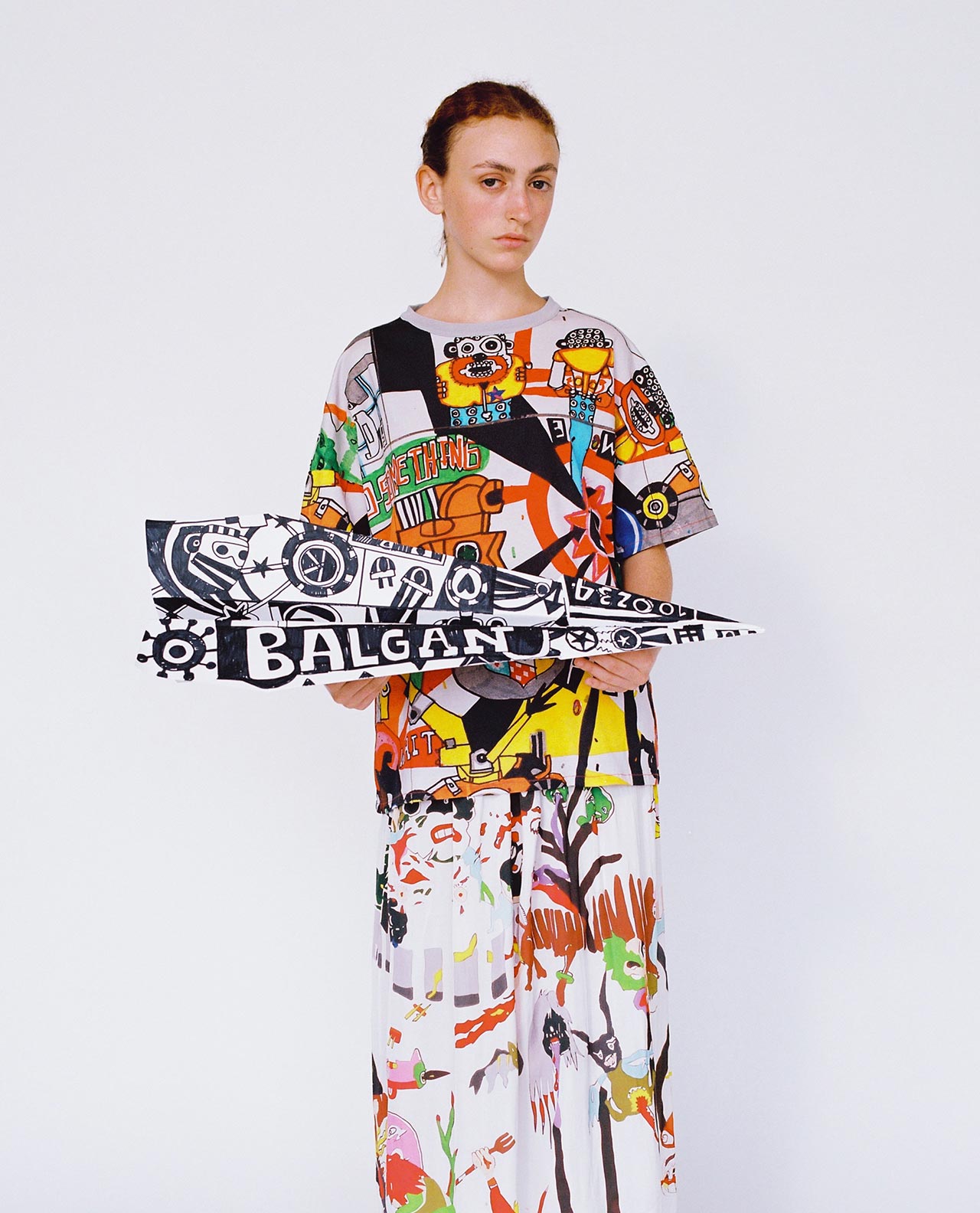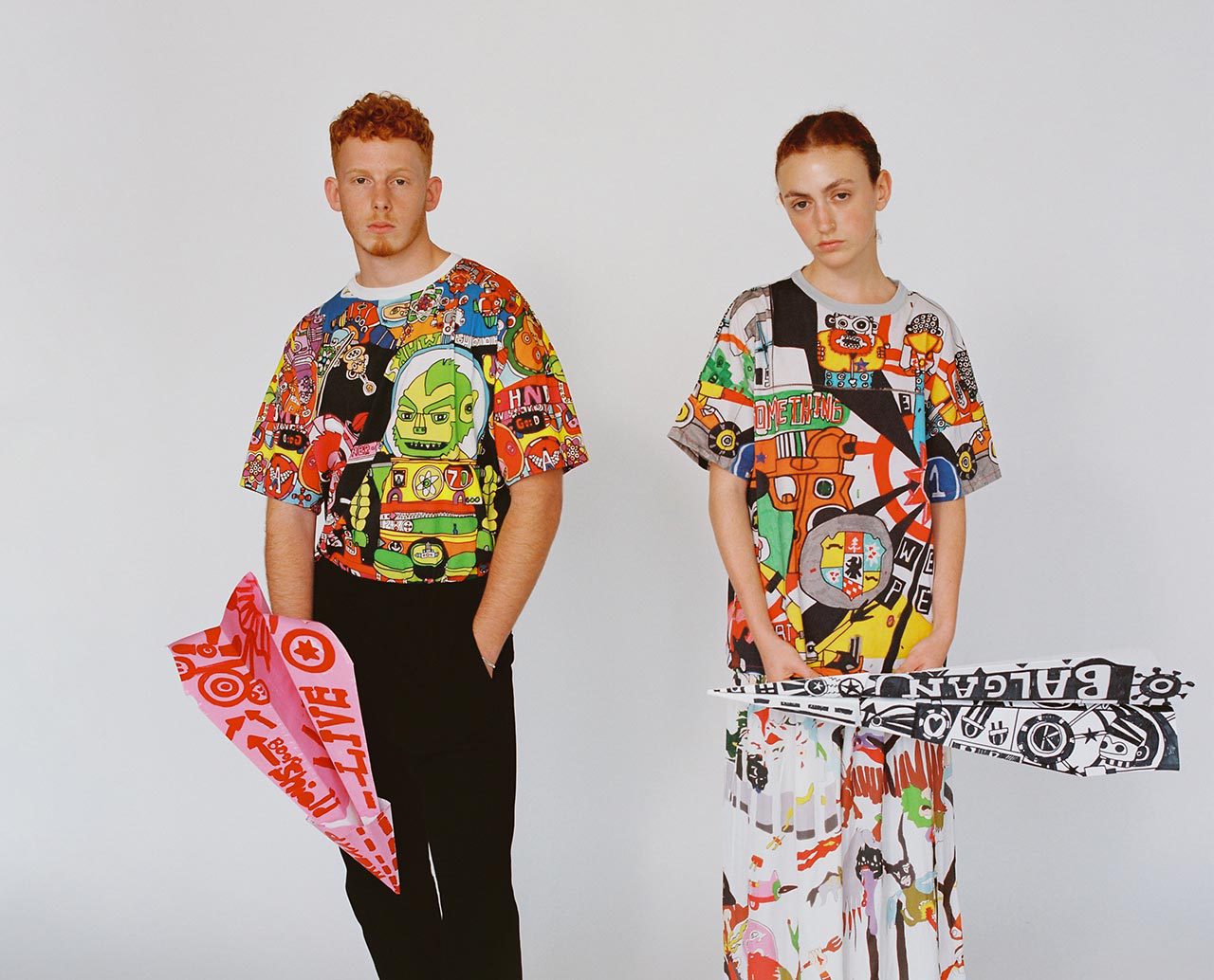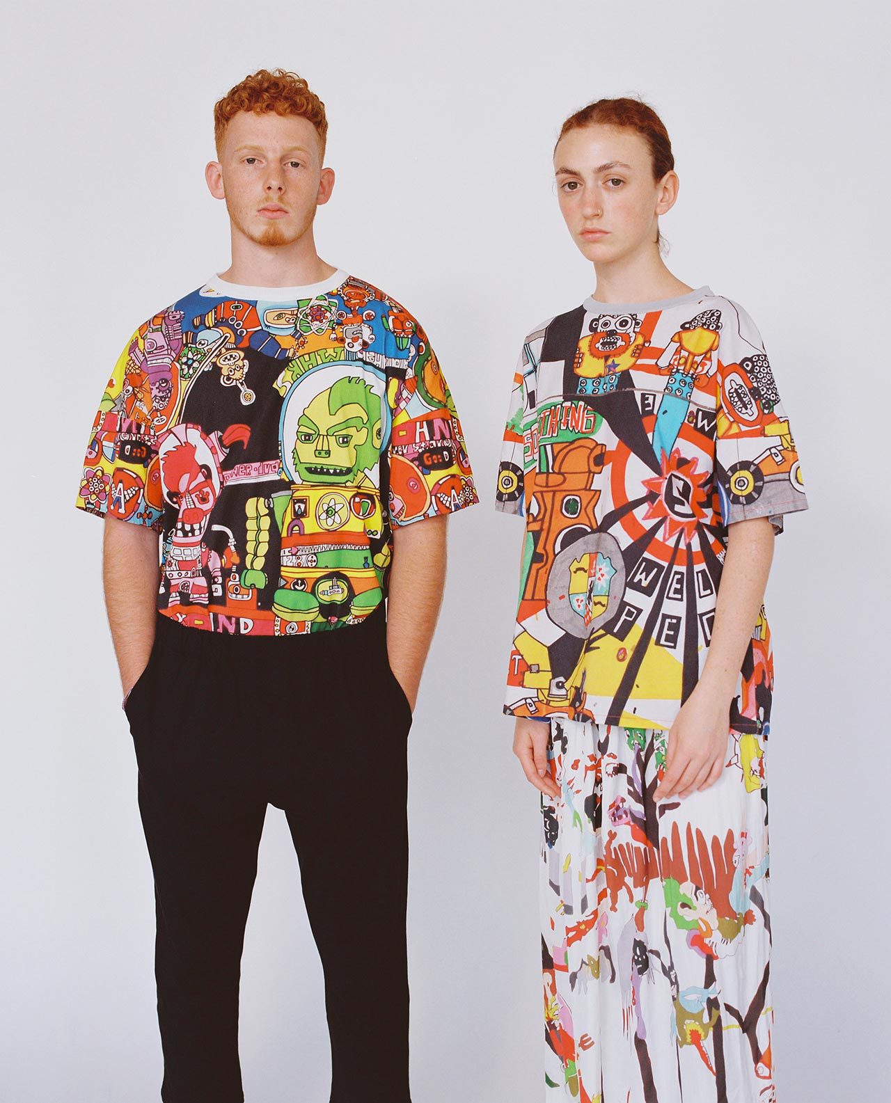 כל הציורים נבחרו על ידי השתיים כבר במפגש הראשון שלהן כשרק העלו את הרעיון וכולם מאוד צבעוניים ומלאים באנרגיה. במבט ראשון מרחוק הם נראים מעט כמו הדפסים יפניים מינמליסטיים, אבל כשמתבוננים מקרוב מגלים את הדיסוננס ומבינים עד כמה הציור אינו רגוע. ״עיצבנו פריטים שבהם העבודות של קרן יוכלו לבוא לידי ביטוי״, מסבירה בר. ״זה היה העיסוק המרכזי ביצירת הגזרות. לא בכל גזרה של בגד אפשר להביא לידי ביטי את ההדפס״.