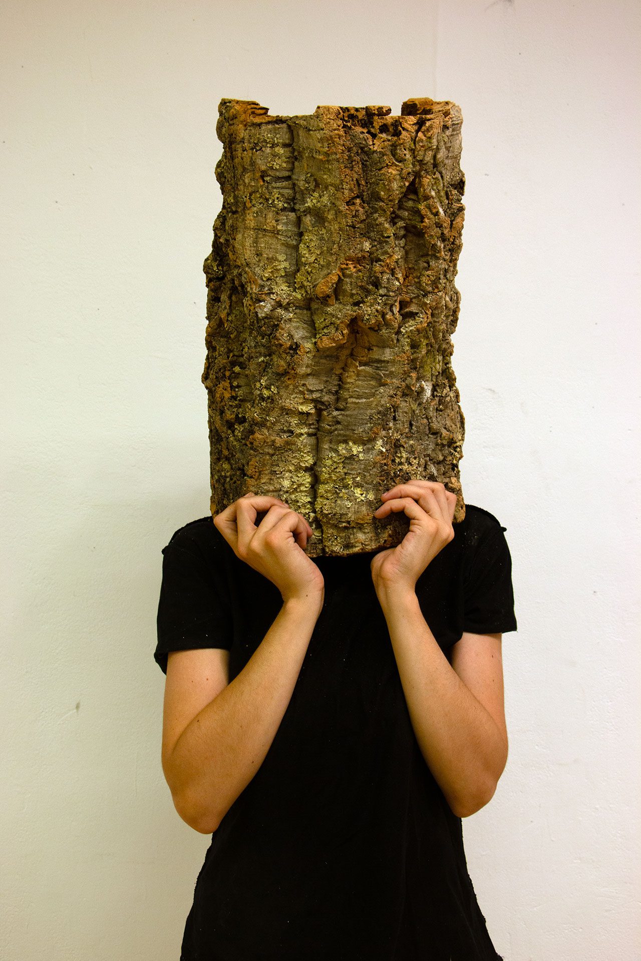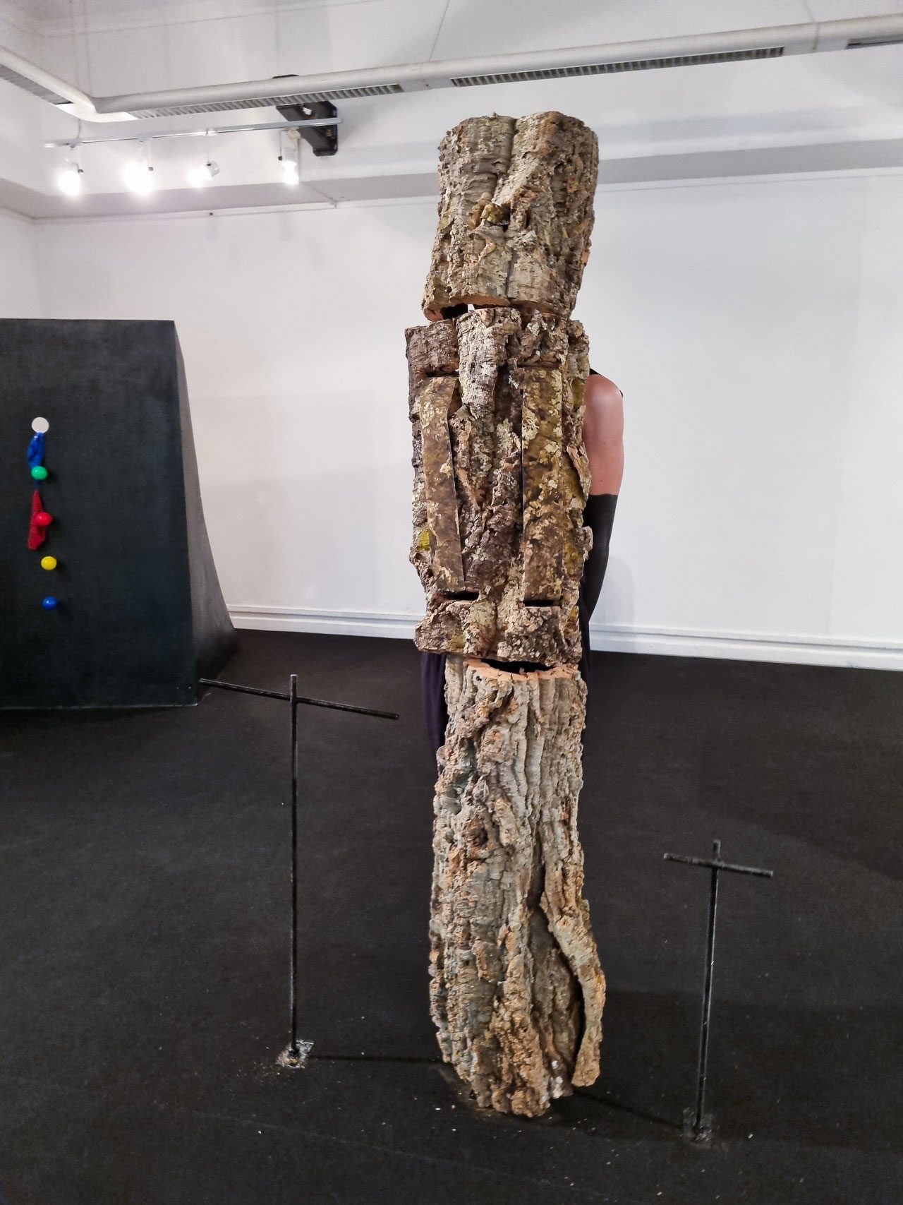 עינב: בתחנה הראשונה יש פרגוד מעץ עם חור שממנו אני מוציאה את הפה, כשהוא מחזיק תמונות פילמים שלי ושל אבי מבצעים קסמים שהיה עושה לי בילדותי. בתחנה השנייה יש קופסה מעץ עם דלת וחור מלמעלה, וכשאני נכנסת אליה היד השחורה שלי יוצאת החוצה. התחנה השלישית נראית בתחילה כמו סתם בד אבל כשאני בפנים היא הופכת לקוואה־קוואה גדולה ושחורה. בתחנה האחרונה שנמצאת באמצע החלל ישנם שלושה חצאי גזעי עץ של אלון שעם שאני לובשת והופכת לגזע אחד נושם