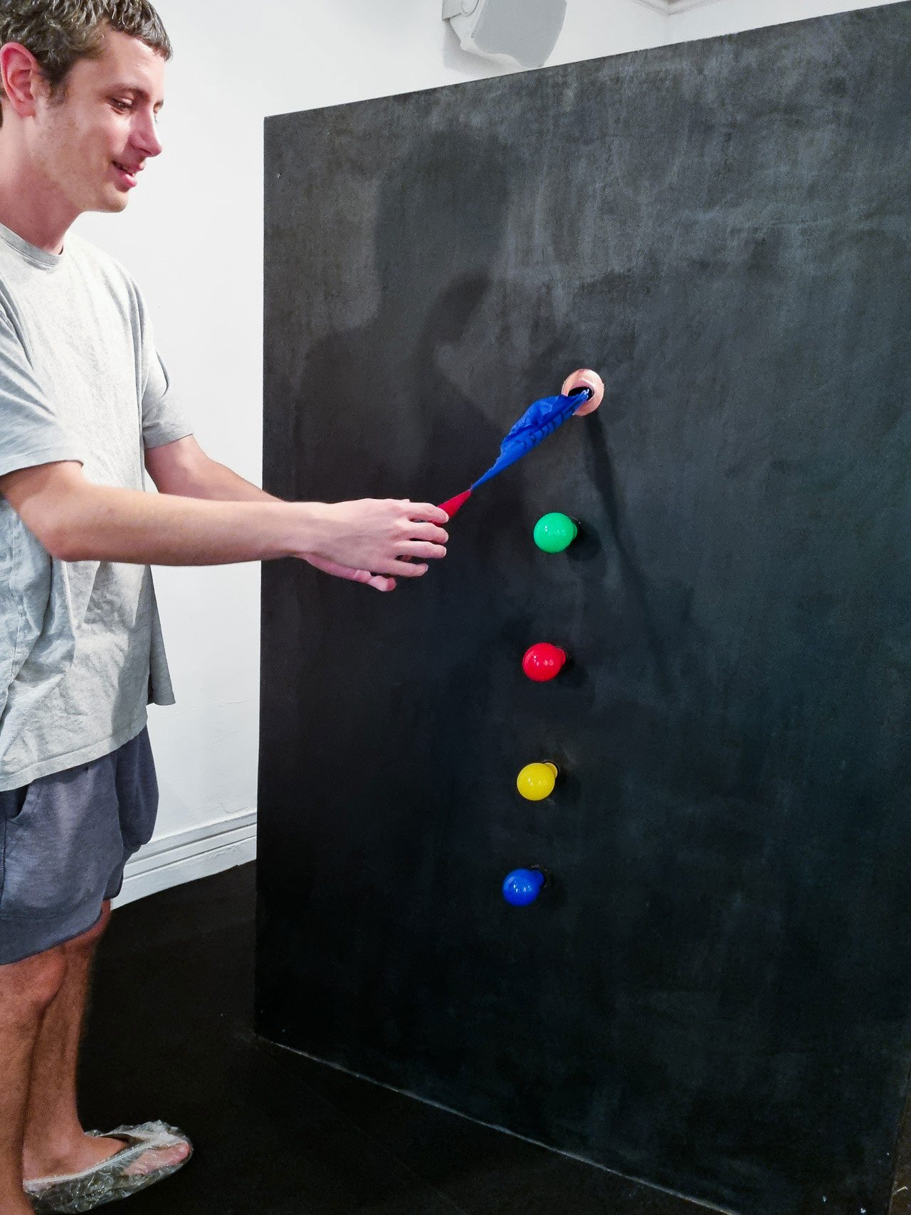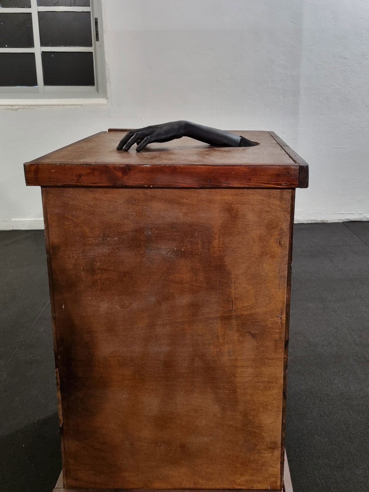 עינב: אני חושבת על מרחבים נוספים שבהם העבודות יכולות להתקיים. התחלתי השנה לצלם וידאו שבו אבא שלי מצולם ברחוב כשהוא לוקח את הקופסה של היד השחורה ומניח אותה בצומת. היד השחורה יוצאת החוצה כשהקופסה נעצרת ונכנסת כשהקופסה נוסעת. בעצם זה רעיון שאני שוקלת לפתח, של נדידת היד השחורה במקומות שונים בארץ