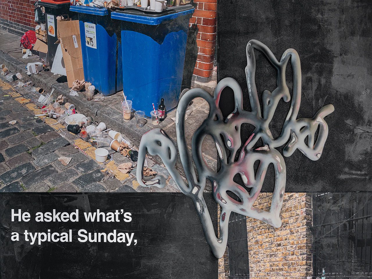 מוטות פיגומים, שלטי חוצות מקומטים, גרפיטי על בטונדה, גדרות מחוררות, שאריות פסולת ופוסטרים קרועים ממסיבות והופעות, נראים רגע אחד כסמלים של התנגדות ורגע לאחר מכן כמובלעה קפטיליסטית של אותו ייצוג שבה ההזנחה העירונית מצטיירת כמחווה רומנטית לאינטראקציות האפשריות בין בני.ות זוג, רווקות.ים שמחפשות.ים להכיר, או כאלו שזה עתה יצאו לדייט ראשון.