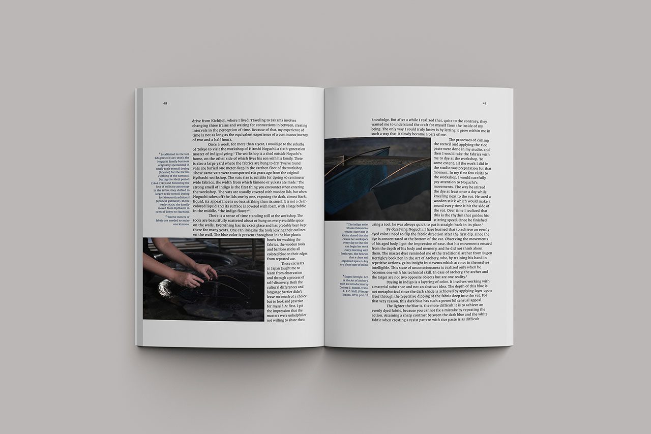 לצד העבודות עצמן, הספר כולל טקסטים מאת אתי גלס גיסיס וקטיה אויכרמן, ושני טקסטים שלי. אחד מהם עוסק במחקר ואופני הפעולה שלי במדיום הטקסטיל, והשני מתאר את חווית הצביעה באינדיגו אצל מאסטרים יפנים ואת הקשר בין צביעה באינדיגו לתפיסת הזמן, שמלווה בתמונות מתהליך הצביעה בבית המלאכה. העבודה בשנה האחרונה על הספר אפשרה לי מבט רפלקטיבי על כל התקופה הזאת וחלק מאיזשהו מהלך של Homecoming