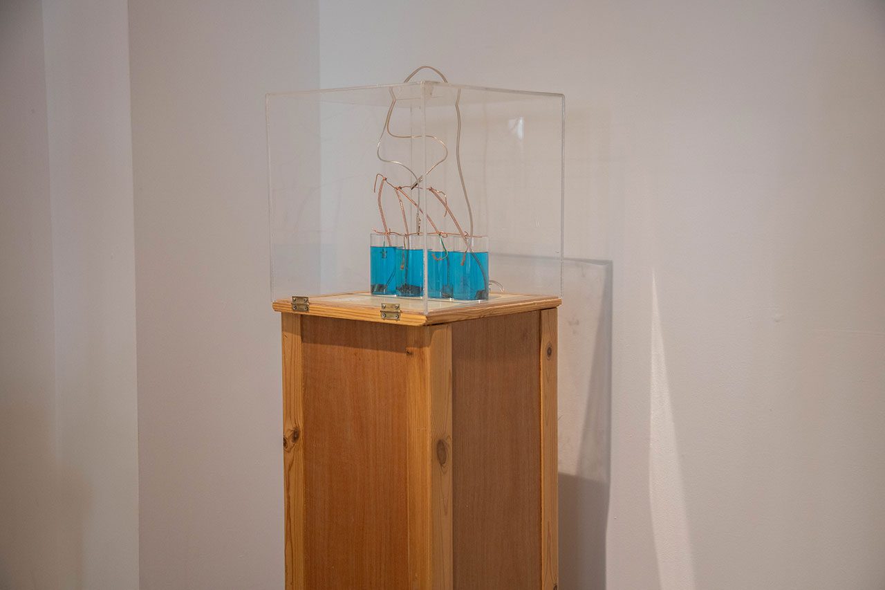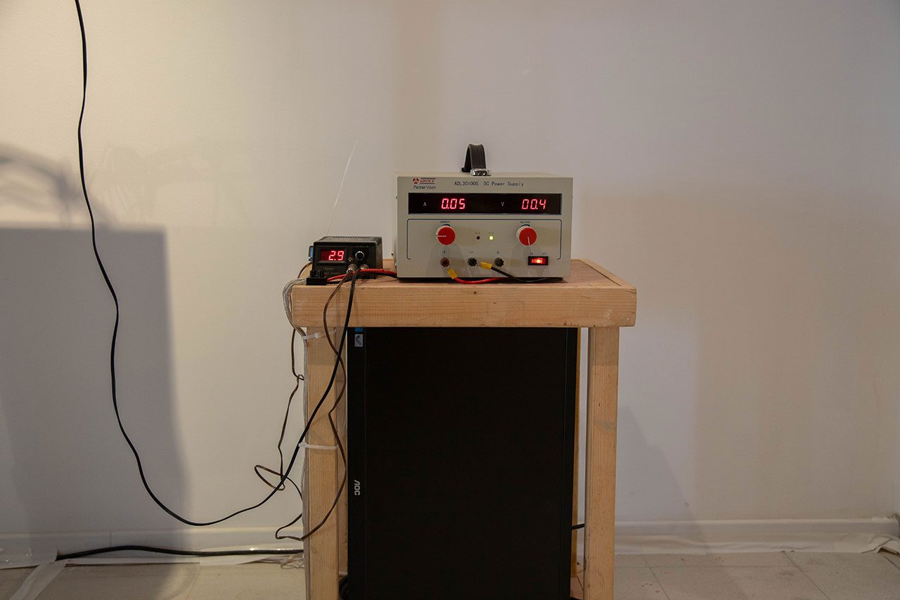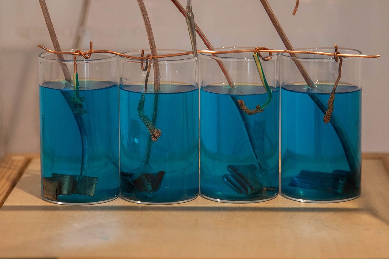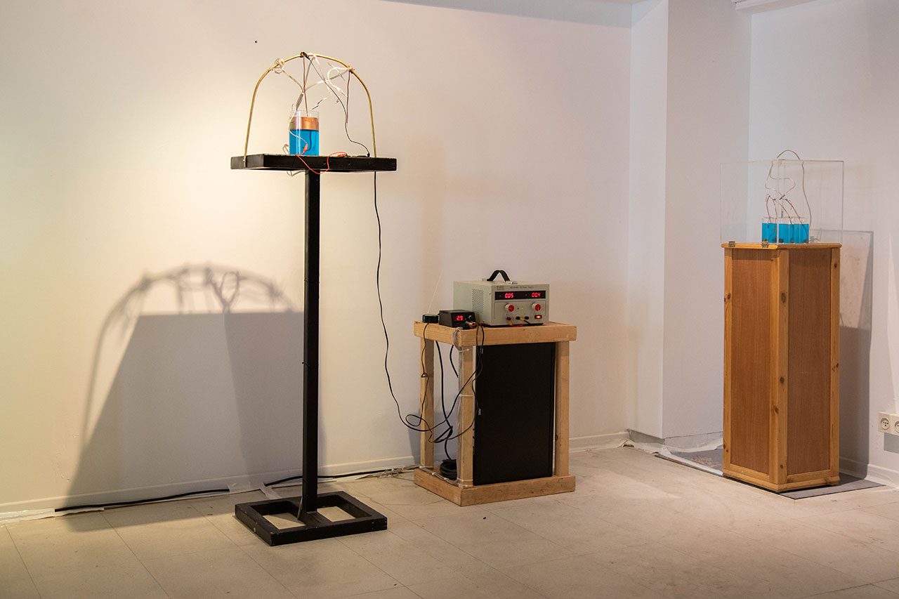 בחלק השני אני מציגה פרויקט שנולד בחודשים האחרונים ועדיין נמצא בתחילת דרכו. הפרויקט שהתחיל במרכז לאמנות דיגיטלית, במסגרת התכנית ״מחקר חומרי״ הנחיית אילי לוי ואביטל ברק, הוא מיצב ״פיסול פרפורמטיבי״ שמורכב מתאים אלקטרוכימיים שבהם גדלים גבישי מתכות טהורות בזמן אמת לאורך התערוכה בתהליך אלקטרוליזה. הפרויקט הזה הוא ניסיון לפתור את המשימה המאתגרת של להביא את אותה המוטיבציה לעולם החומרי.