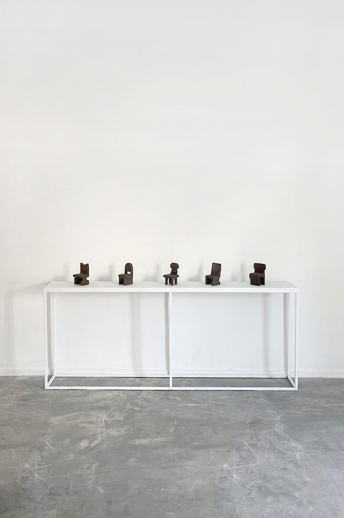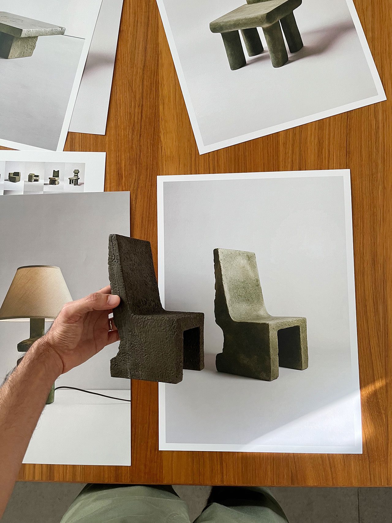 דורון: התערוכה CAN/T TOUCH THIS (נעילה: 31.12) בוחנת תהליכי עבודה חדשים בעידן הבינה המלאכותית. אני מציג קולקציית רהיטים שעיצבתי תוך שימוש בכלי בינה מלאכותית, יחד עם וידאו קצר שגם נעשה בבינה מלאכותית שמציג את סיפור הבריאה הבדיוני של הקולקציה. כמו כן, תרגמתי חמישה כסאות מהקולקציה מהעולם הווירטואלי לעולם הפיזי ויצרתי מהם דגמים מוקטנים שהדפסתי במדפסת תלת־ממד