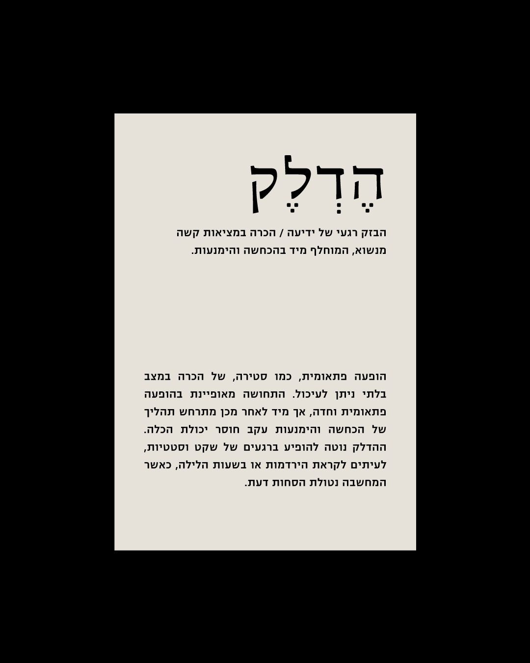 הֶדְלֶק – הבזק רגעי של ידיעה / הכרה במציאות קשה מנשוא, המוחלף מיד בהכחשה והימנעות. הופעה פתאומית, כמו סטירה, של הכרה במצב בלתי ניתן לעיכול. התחושה מאופיינת בהופעה פתאומית וחדה, אך מיד לאחר מכן מתרחש תהליך של הכחשה והימנעות עקב חוסר יכולת הכלה. ההדלק נוטה להופיע ברגעים של שקט וסטטיות, לעיתים לקראת הירדמות או בשעות הלילה, כאשר המחשבה נטולת הסחות דעת.