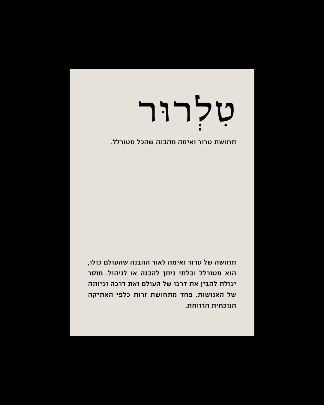 דורון: בטח הנה כמה: טִלְרוּר – תחושת טרור ואימה מהבנה שהכל מטורלל, שהעולם כולו מטורלל ובלתי ניתן להבנה או לניהול. חוסר יכולת להבין את דרכו של העולם ואת דרכה וכיוונה של האנושות. פחד מתחושת זרות כלפי האתיקה הנוכחית הרווחת.