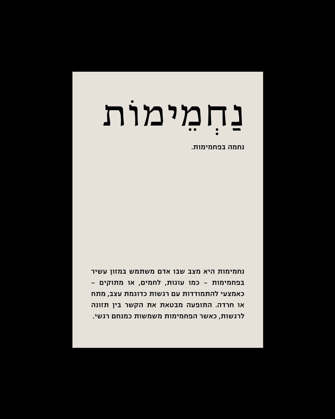 דורון: המילון העברי החדש הוא פרויקט שיצרתי יחד עם ליאת לוי עזרן (לולה), חברה יקרה. לולה העלתה פוסט על כך שחסרות מילים בלקסיקון העברי, שיכולות לעזור לנו לתאר את התחושות שעלו מאז תחילת המלחמה. כתגובה לפוסט הזה חשבתי על כמה מילים והעליתי לאינסטגרם. הרבה א.נשים שיתפו, אז פתחנו לזה עמוד וביקשנו מאנשים להציע רעיונות משלהם. ככה נבנה לו אוסף של מילים חדשות שמתארות תחושות חדשות שהרבה אנשים מרגישים