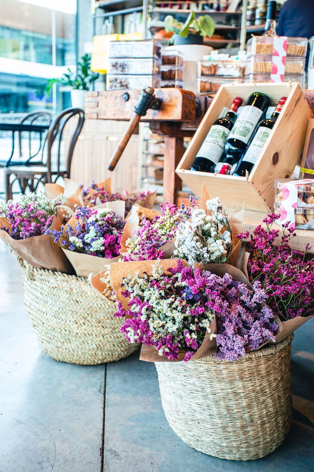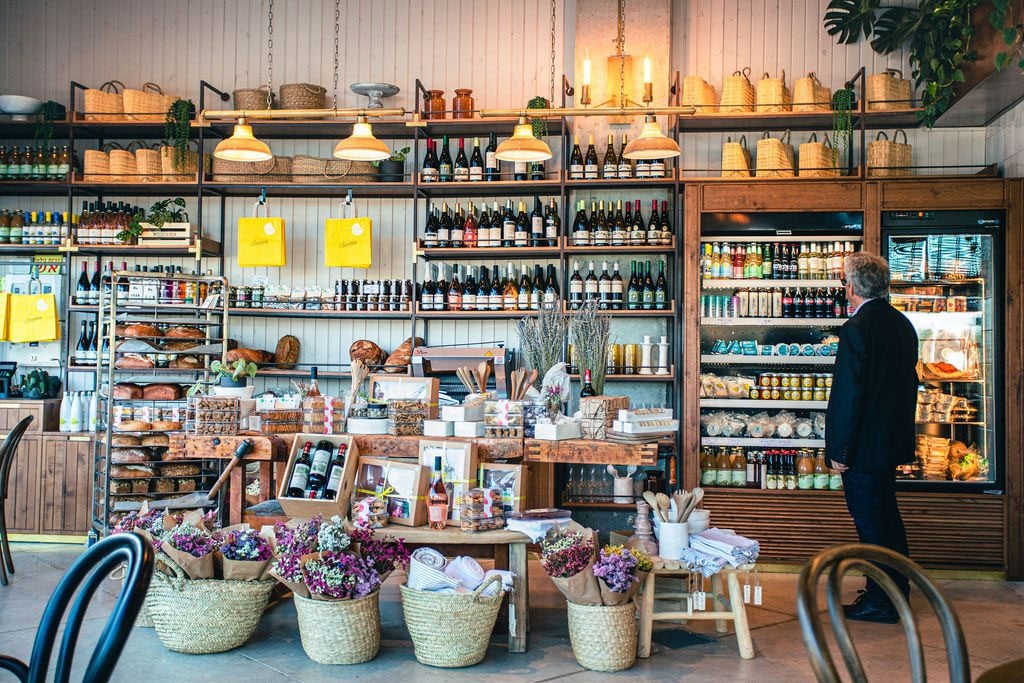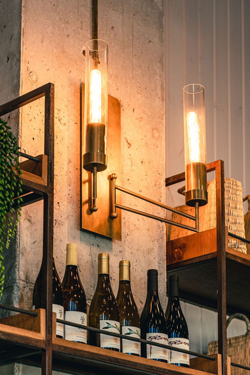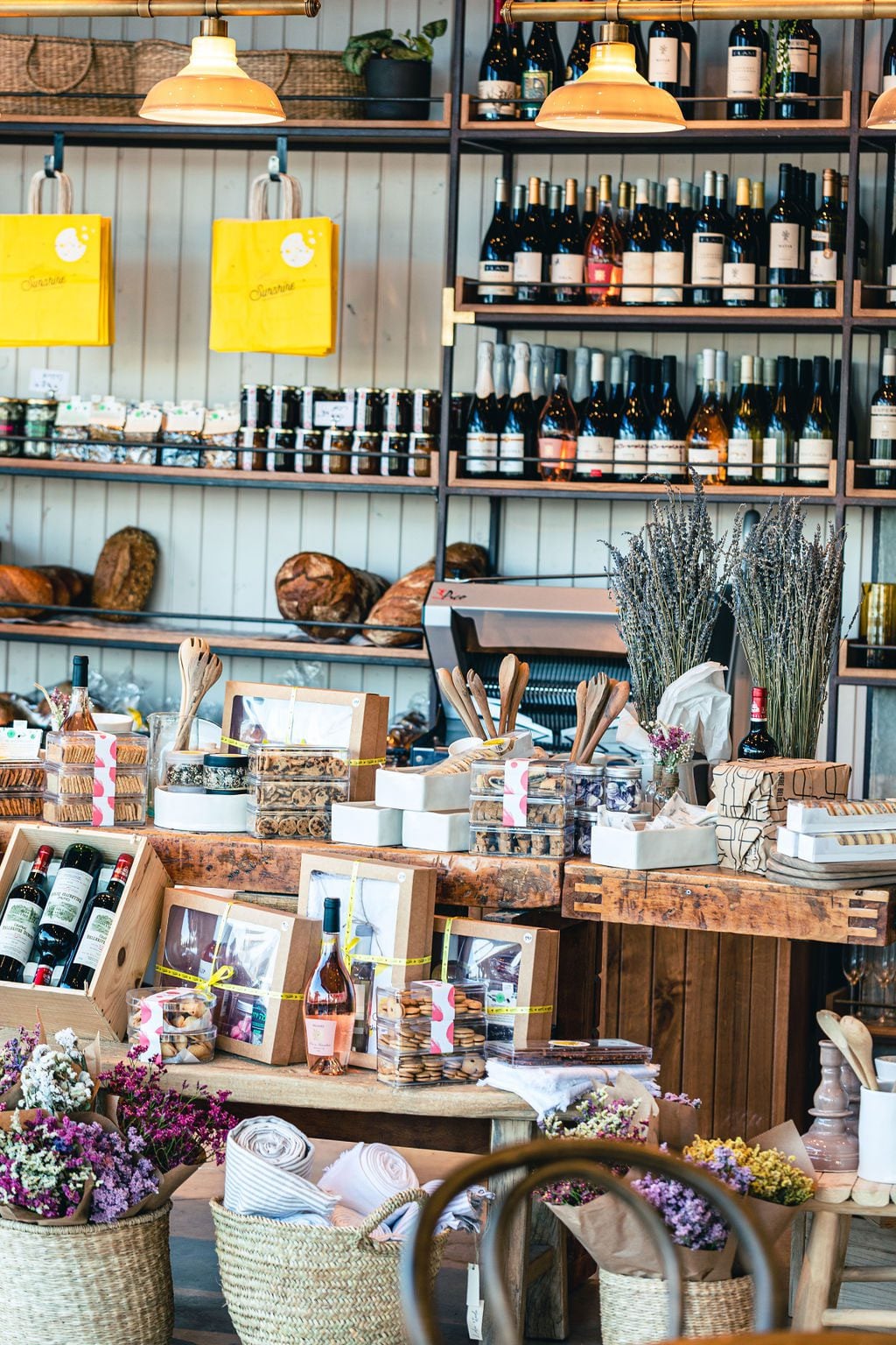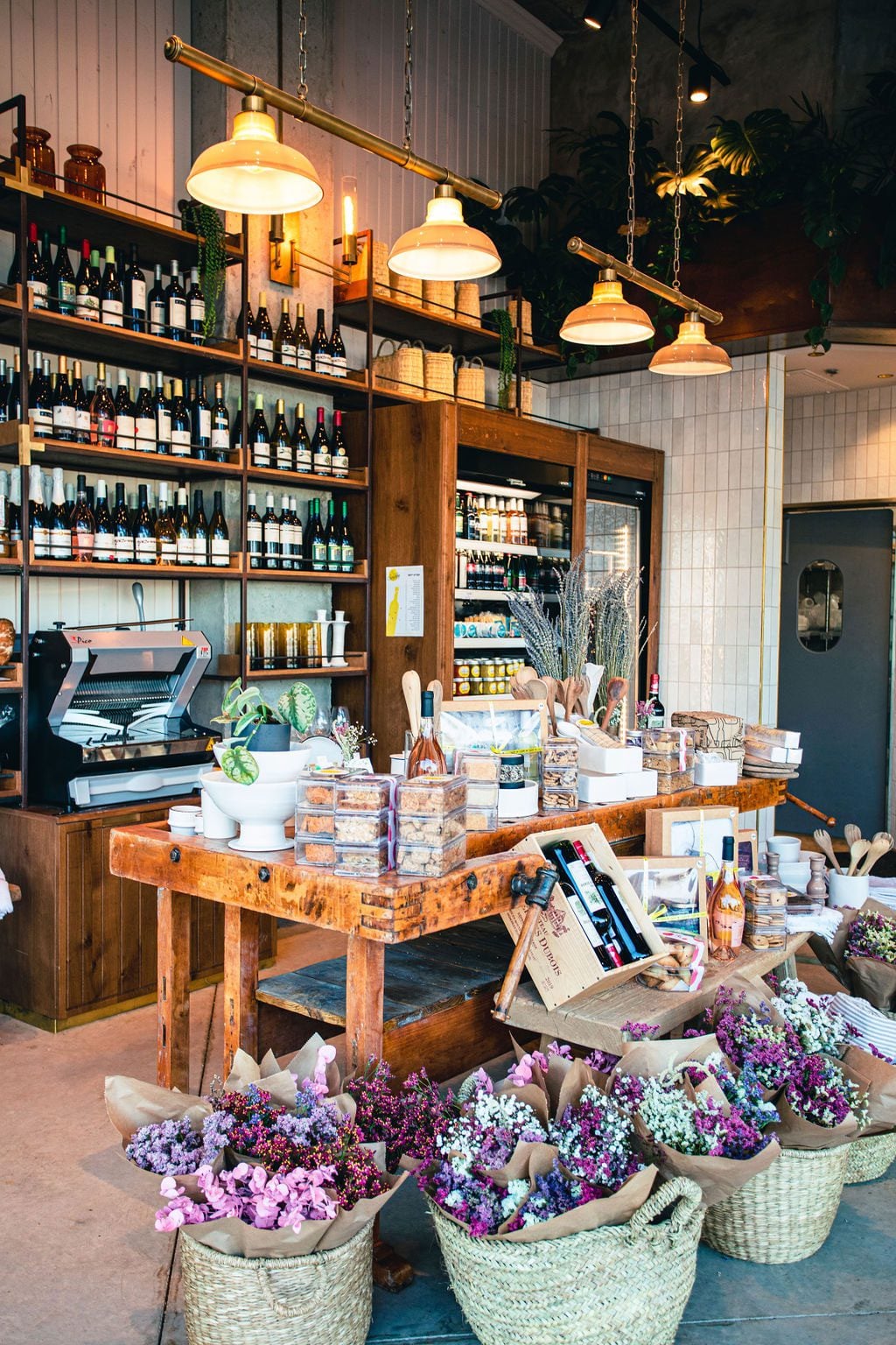 מבחינת הצבעוניות והחומריות רצינו לעבוד עם חומרים טבעיים. עשינו שימוש בעץ אלון מגוון בכל עבודות הנגרות, בברזל בעיבוד קורטן, ובנגיעות של פרטי פליז – במחברים, בידיות ובתאורה הדקורטיבית. הדלפקים והחיפויים משלבים שימוש באבן טבעית ירוקה, שנותנת קונטרה ומדגישה את המוצר המוצג שעליה. היא מוסיפה אופי לאווירה ומשתלבת עם גווני הצמחייה הטבעית שנשפכת מהקירות.