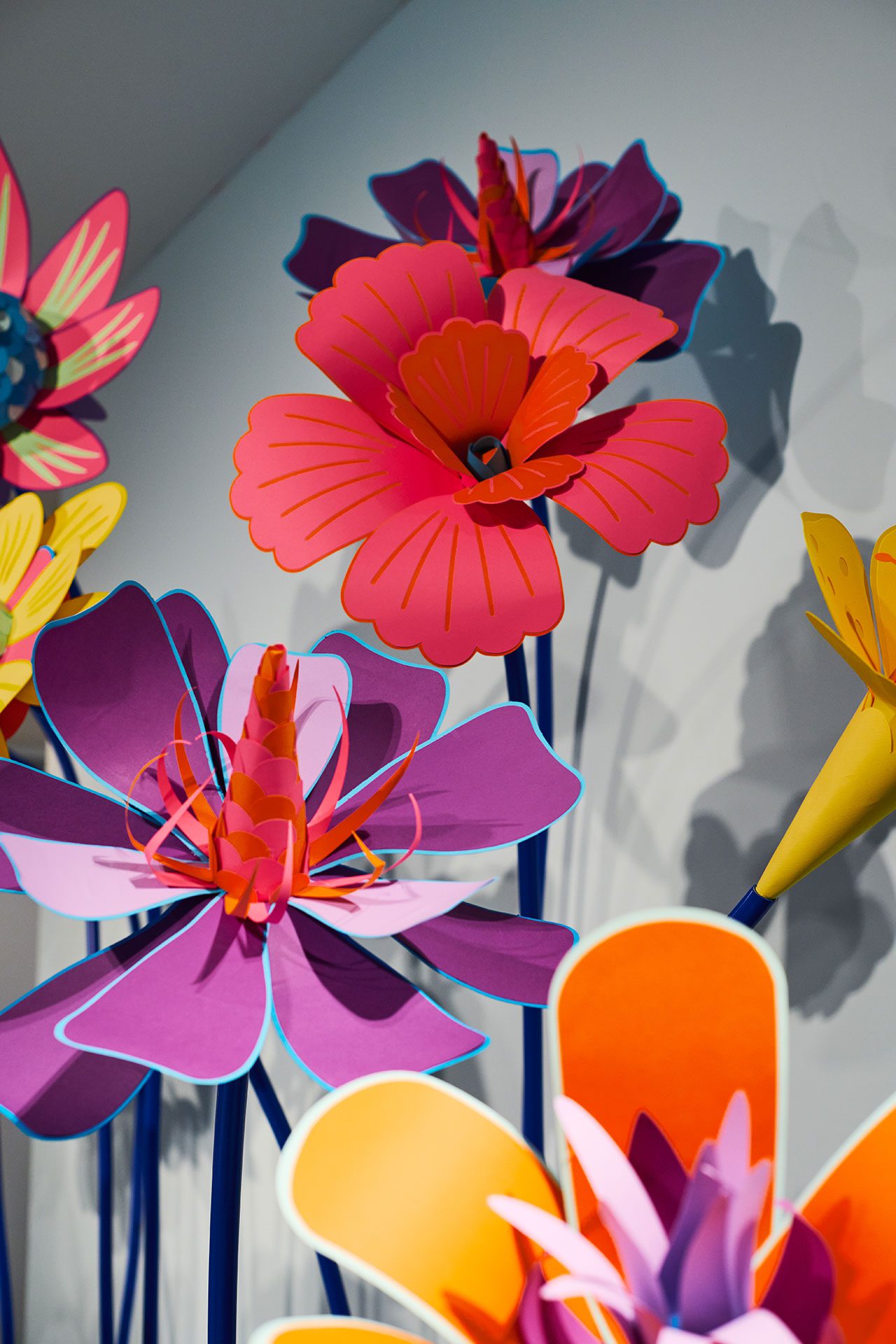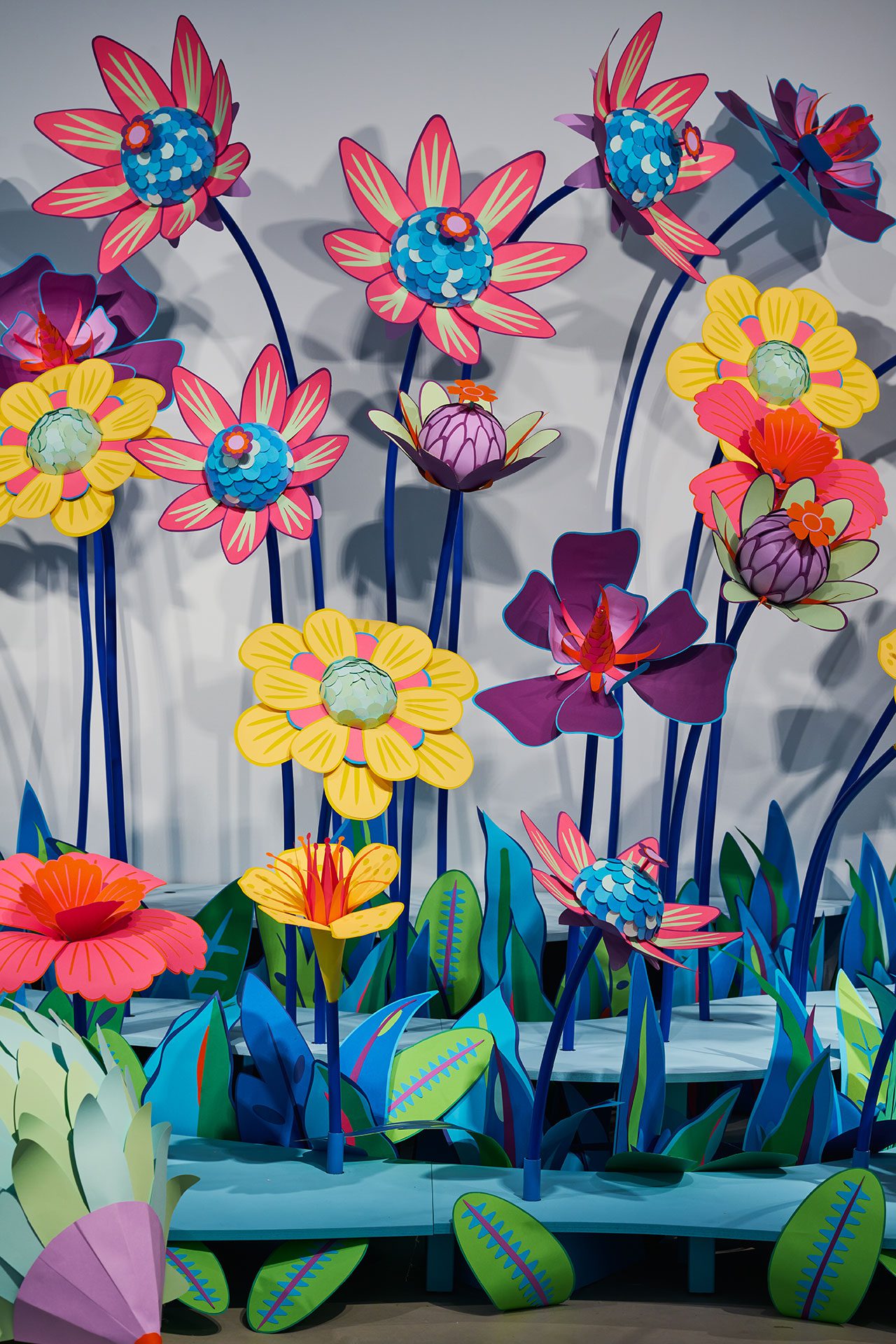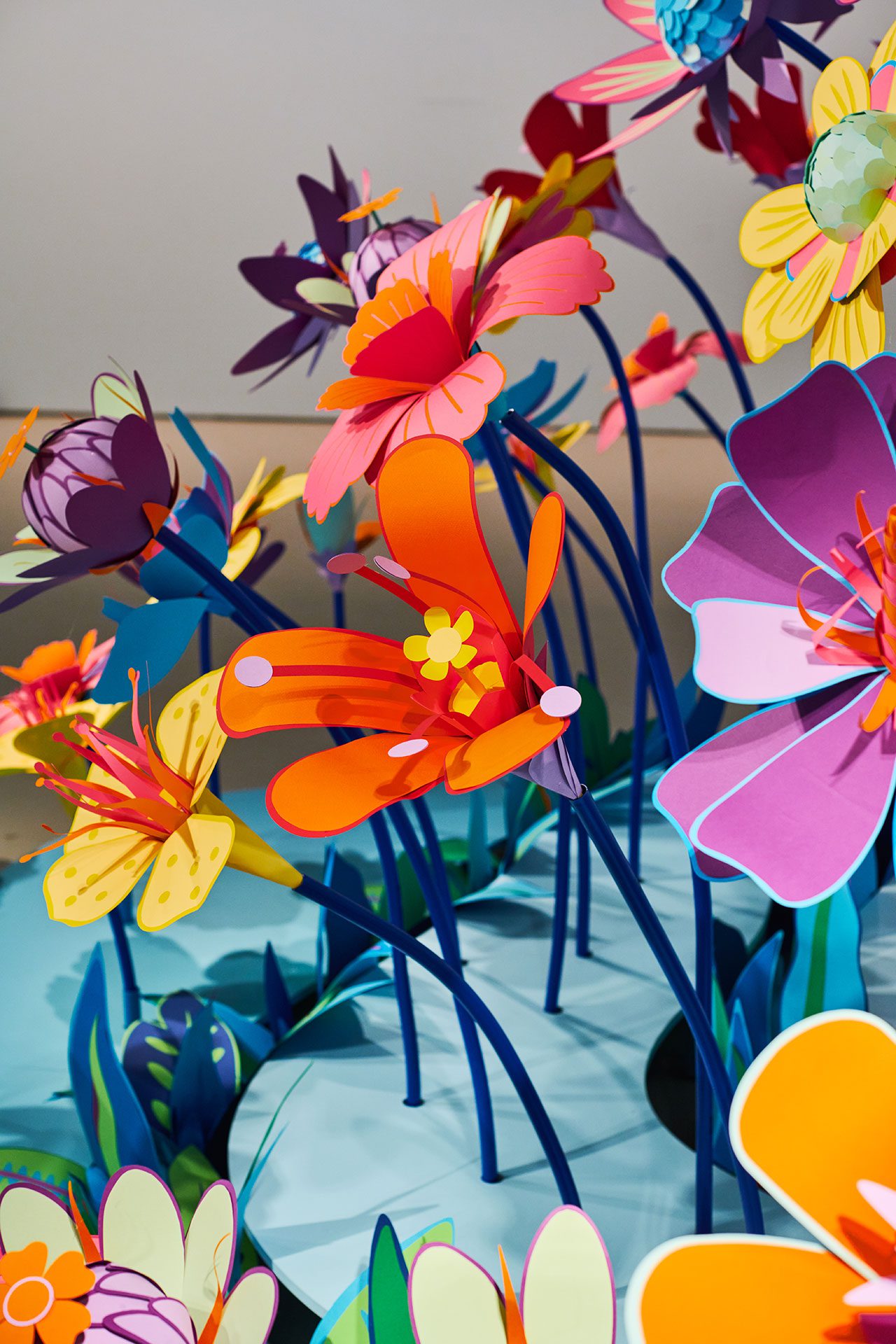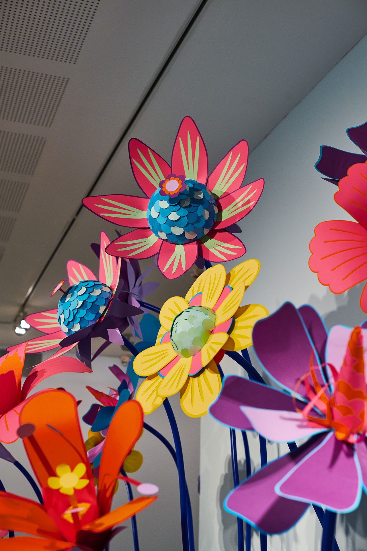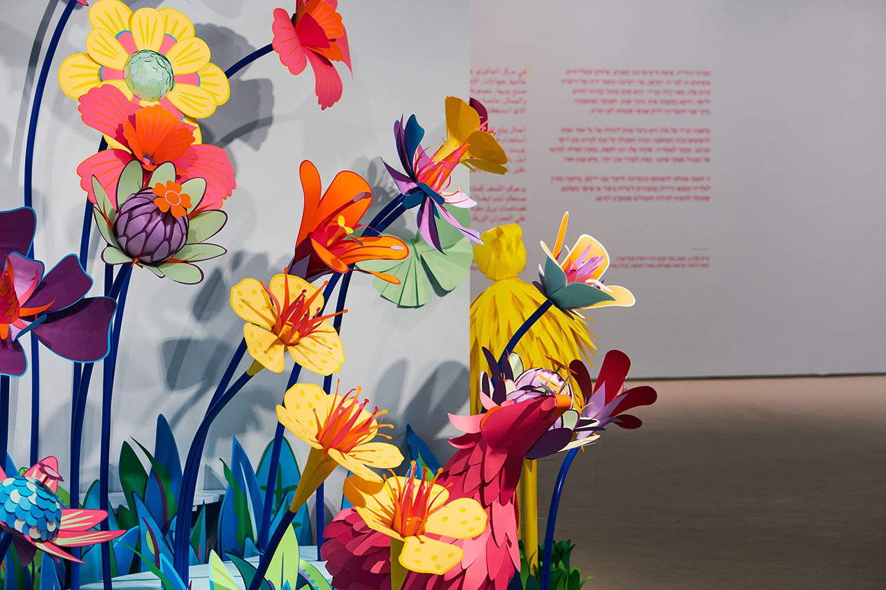 ״כל פרח עשוי בצבעוניות שונה, עוצב ונוצר על ידי בפעם הראשונה לטובת התערוכה. האוביקטים נוצרו בטכניקה של מגזרות נייר שנעשות במכונת חיתוך (פלוטר), כשאת העיצוב של כל פרח תכננתי עוד בשלב שלפני. לא רציתי להציג טבע בצבעים הרגילים שלו. בעבודות שלי אני לא מנסה להיצמד לצבעים המקוריים, אני תמיד מנסה לתת את הפרשנות שלי מבחינה צבעונית. הצבעים הם צבעי הקשת, שאותם ערבבתי בכל פעם בצורה אחרת, בהתאם להשראה ולהחלטה שלי על הנראות של הפרח״.