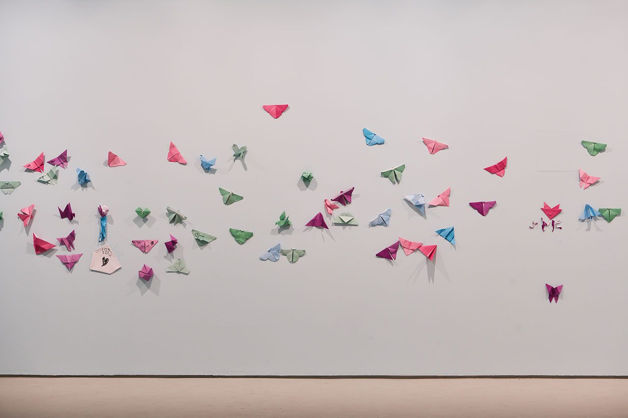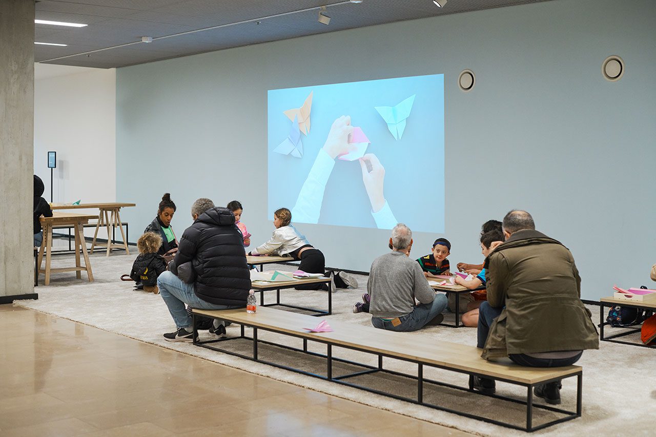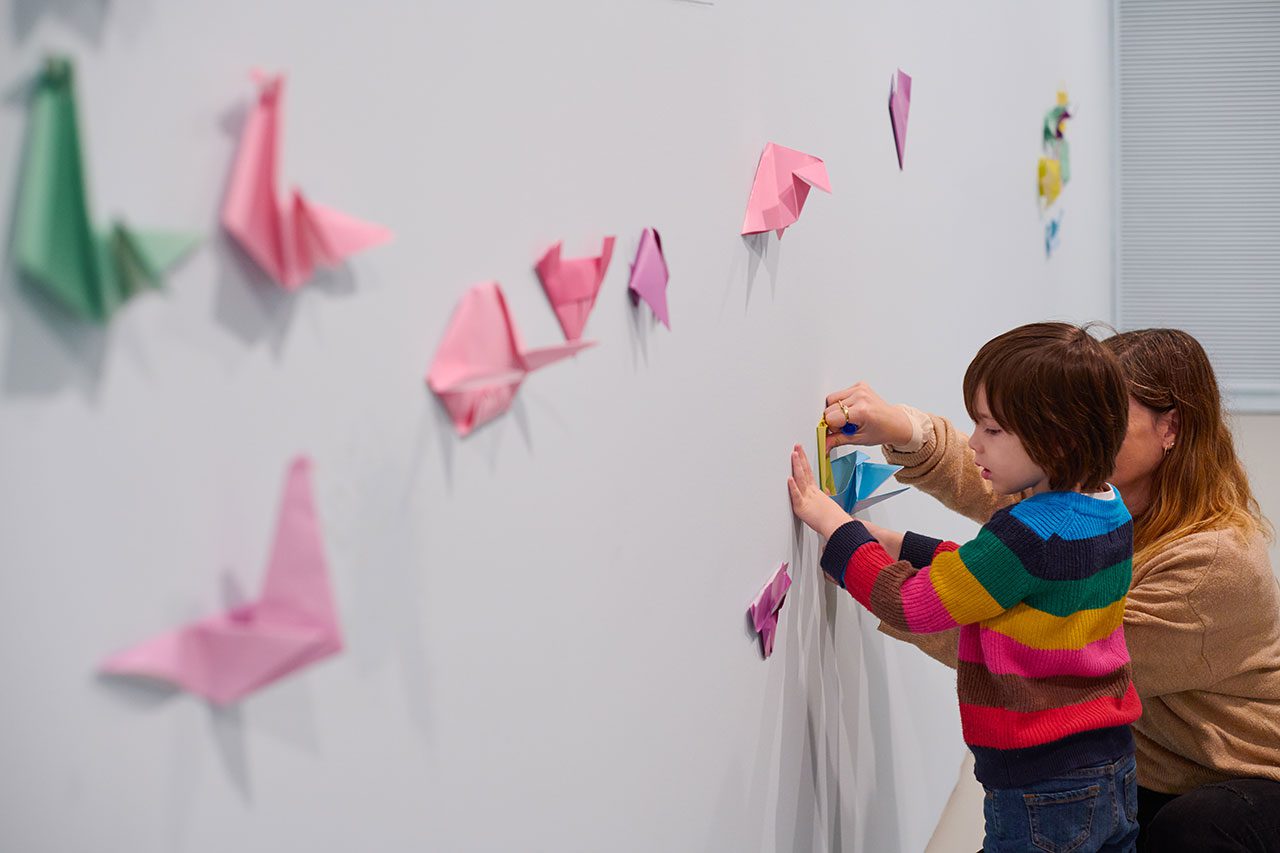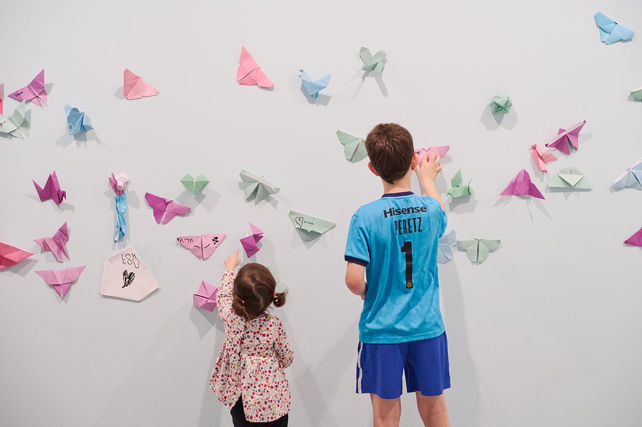 המבקרים בתערוכה מוזמנים לקחת חלק במיצב, ולקפל במלאכת האוריגמי ציפורים ופרפרים בעזרת סרטונים שבהם מדגימה פלג את אמנות הקיפול. בתום היצירה הם מוזמנים גם לקשט איתם את הקירות התכולים מסביב (וגם להוסיף עליהן את שמם), שכבר הולכים ומתמלאים בעבודות – מה שמוסיף אלמנט צבעוני נוסף לתצוגה.