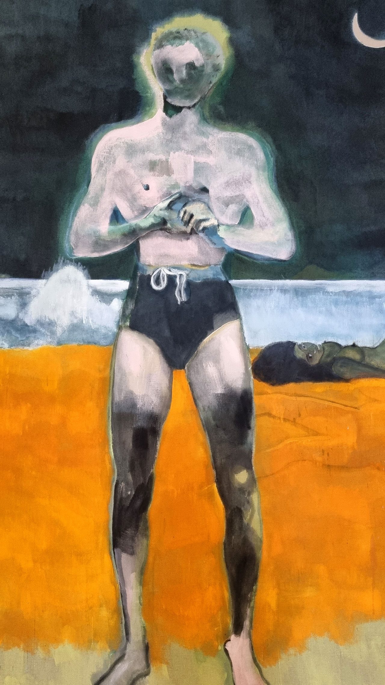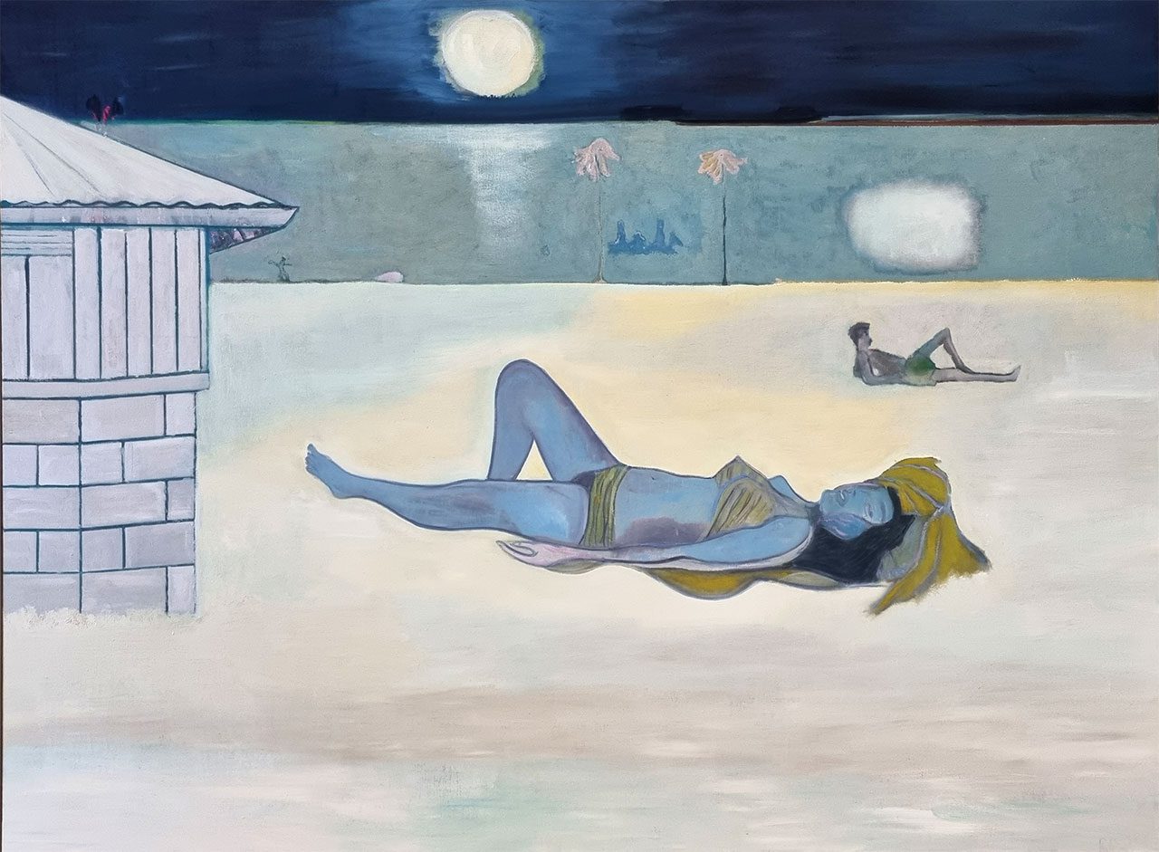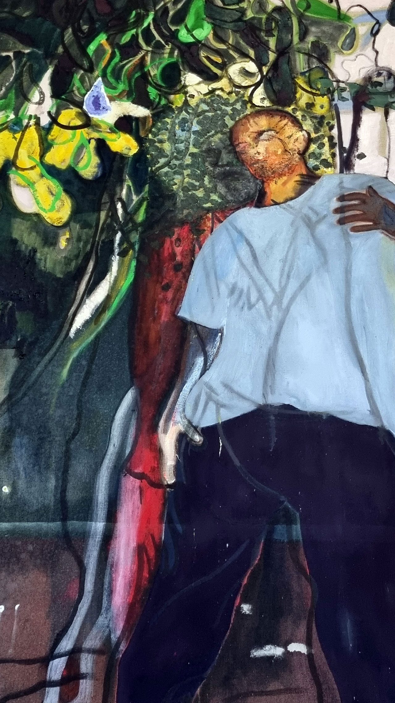 גודלן של הדמויות, אופן ההצבה בקומפוזיציה, שאב לעולם של הרהורים, אינטימיות, בדידות, שעובר דרך החופש במבע הציורי. הצבעוניות המתעתעת מוציאה אותנו מהמבט ההרגלי, הכתמים המופשטים מלאים חיים ותנועה. הקווים הפרומים, שלפעמים נראים מרושלים, סימני המחיקות, מחזקים את תחושת ההתמוססות פנימה. לצד זה, חוזרים בעבודות גרידים גאומטריים, כמו איזה רצון לקרקע, לתקוע יתדות בתוך כל הריחוף החלומי הזה; תמהיל כתב היד הדויגי.