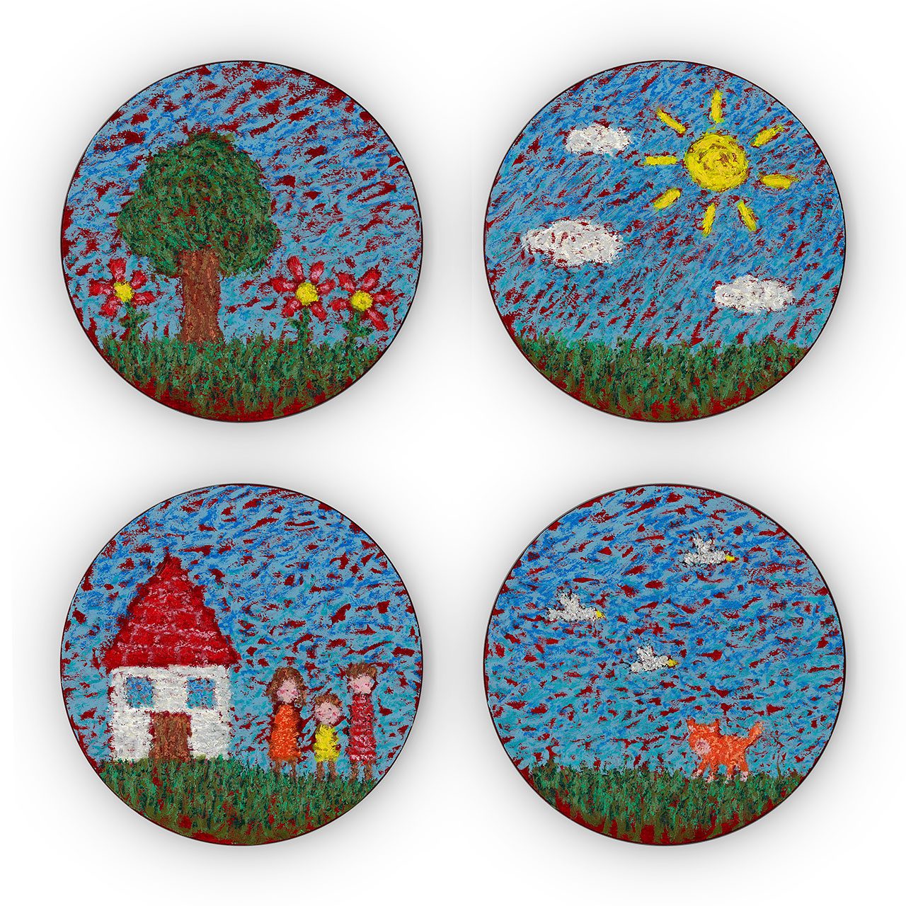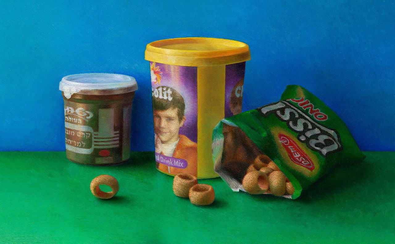 ציור אחד מתאר נוף מדברי של חלה ובייגל שמונחים על שולחן, בצבעים חומים וצנועים. בציור השני של נוף ילדות ישראלית – ביסלי, שוקולית ושוקולד השחר, בצבעים עזים במיוחד. העבודה השלישית היא גריד של תשעה ציורים של פלפלים בצבעים פופיים. העבודה הרביעית היא החריגה מביניהן, גריד של ארבעה פאנלים עגולים בסגנון ציור נאיבי