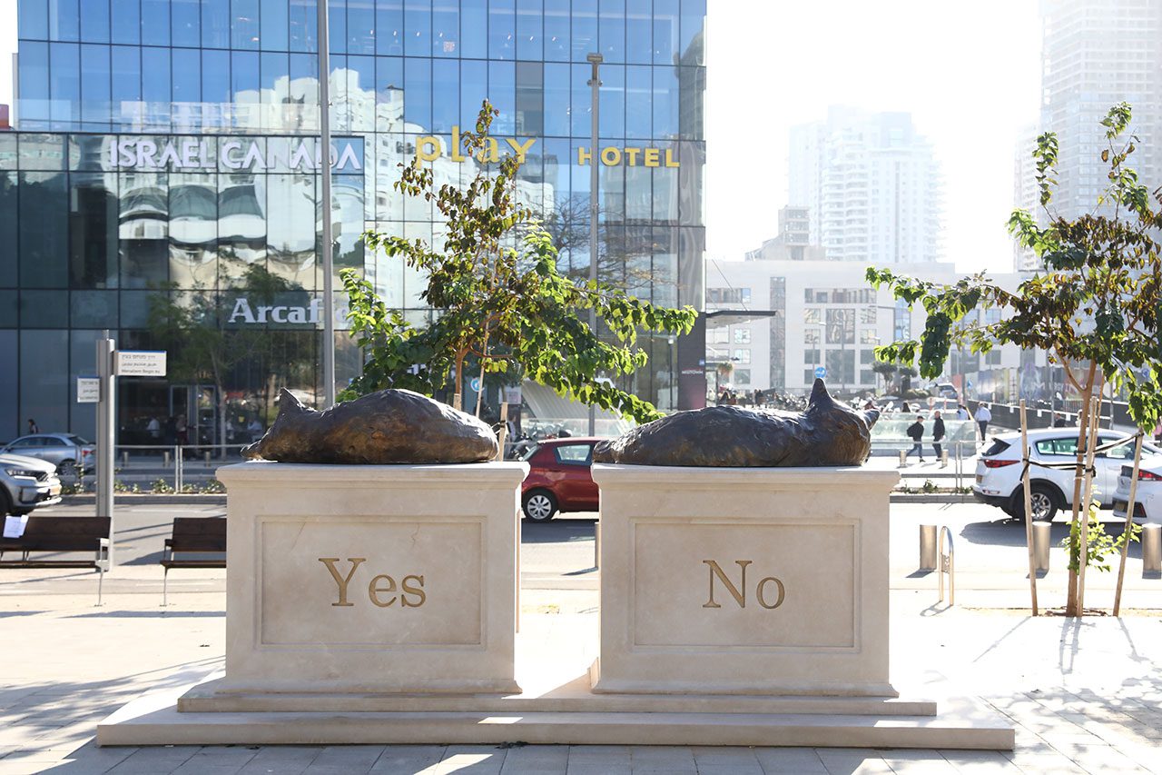 מיקום: שדרות שאול המלך פינת מנחם בגין. פסלי ברונזה ואבן (זוג חתולים ענקיים ישנים יצוקים ברונזה, וזוג בסיסי אבן עם החריטה ״כן״ ו״לא״)