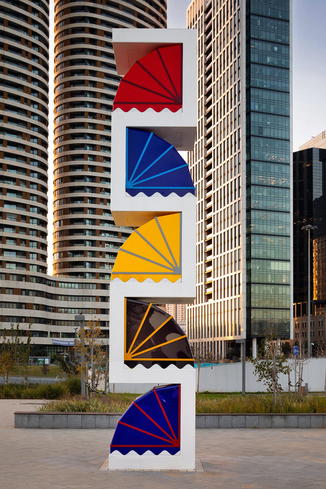״הפסל, בגובה 7 מטרים, עשוי מחומרים מודולריים, צבעוניים ויומיומיים ומורכב מחמישה סוככי מרקיזות צבעוניים, תל אביביים מאוד, שהורכבו זה על גבי זה״, מסבירה האוצרת סמדר שינדלר. ״הוא ממוקם על ציר התנועה המרכזי על פרשת דרכים, ביציאה מתחנת הרכבת הקלה ברחוב ארלוזורוב, מול תחנת הרכבת סבידור מרכז ותחנת האוטובוסים מסוף 2000.