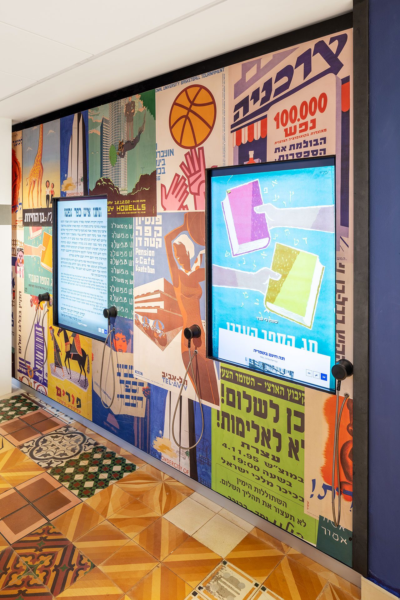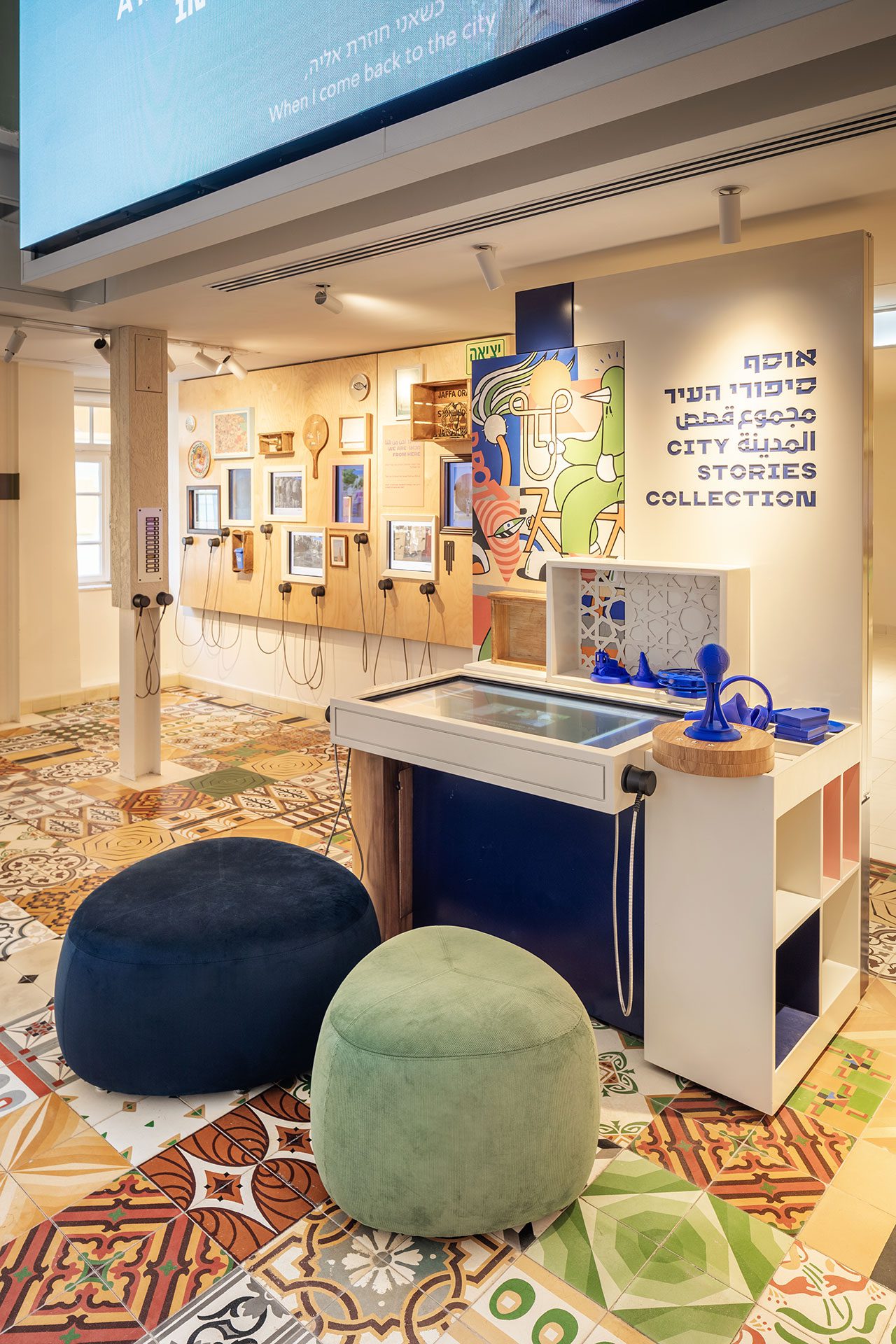 אוסף הסיפורים מוצג בקומת הכניסה המרוצפת באריחים מצוירים בטעם של פעם. האוסף, שנצבר בעקבות קול קורא ומלאכת איסוף שקדנית, נשען ברובו על אמצעים דיגיטליים ואינטראקטיביים, דוגמת שולחנות עם מפות כמסכי מגע שכל לחיצה על נקודה בהן מפגישה עם סיפור אחר, מפת ציר זמן אינטראקטיבית המוצגת על הקיר ומזמינה גם כן ללחוץ על נקודות בה כדי להגיע לסיפורים מבוקשים, או אוסף כרזות דיגיטלי, שבמגע יד של המבקר על כרזה נבחרת מספק הסבר עליה