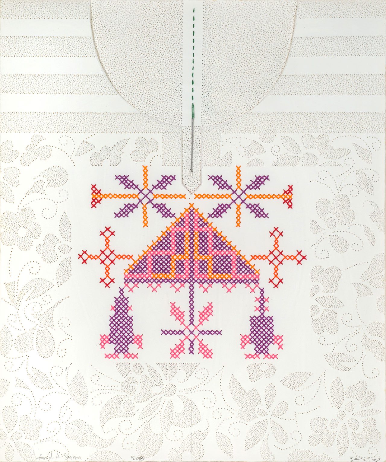 מתוך הרקמה העדינה והנייר המחורר מבצבצים מטוסי קרב, ואילו המחט החרוצה והעמלנית של הרוקם הופכת לקוץ מכאיב בשוליה של רקמה משמלה פלסטינית משנות ה־50. אחת העבודות המעניינות בהקשר זה היא שטיח תפילה שנעוצות בו אלפי סיכות כמעט בלתי נראות המהדהדות בצורתן את הדגם אורנמנטלי שלו. השטיח – חפץ יומיומי חם אך ״קוצני״, מגלם בתוכו מורכבות שבין משיכה אליו ודחייה ממנו.