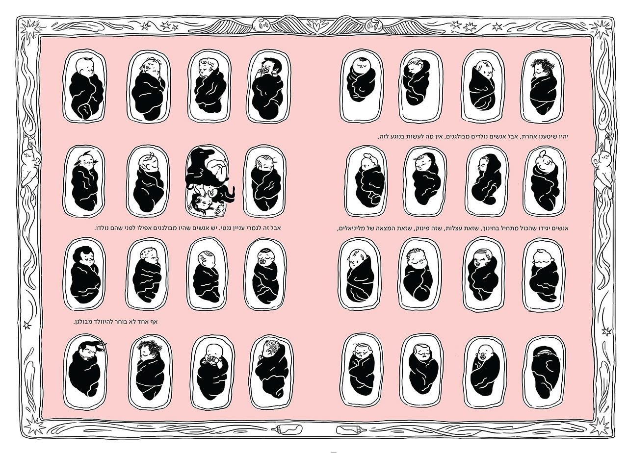 עינת: אני אוהבת את הכפולה הפותחת, של התינוק: אנשים נולדים מבולגנים. היא גם נקודת הפתיחה והסגירה של הספר (ספוילר – יש לה כפולת ראי בסוף כי אנשים גם מתים מבולגנים), והיא גם כנראה המוטיבציה האישית שלי לכתוב את הספר הזה.