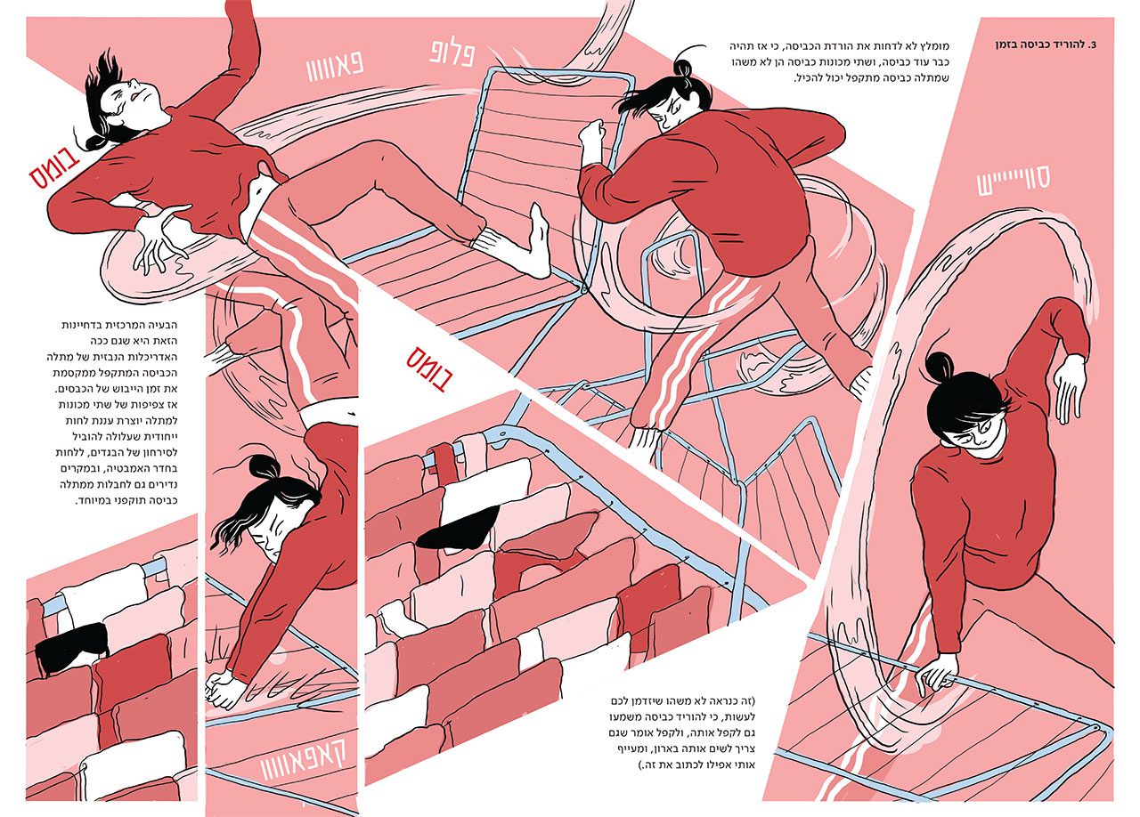 אבל בעוד שם השפה האיורית מאוד רזה, כדי להעביר את הרעיון, פה היה לי חשוב שהשפה תהיה עשירה ואפילו מפוארת, אולי כי הרעיון הוא בין השאר היופי והעושר שיש בבלאגן. וגם כי הייתי חייבת למצוא דרך מעניינת לצייר כפולה שהגיבורים שלה הם מדיח, סל עיתונים וכביסה והקערית הקטנה של המפתחות