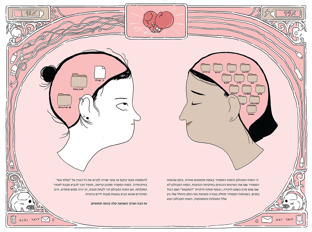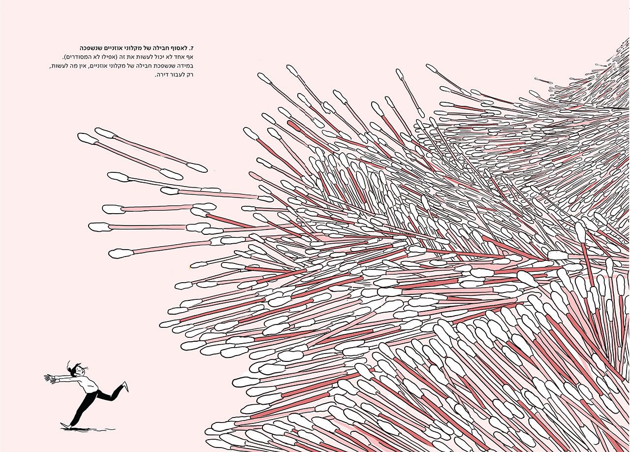 יובל: אני איתך. ובואי נדבר על הספר שסיפרת לי עליו מזמן, עוד שהתארחת בפודקאסט (פרק 27!), ולאחר מכן הזכרת לי אותו כשדיברנו בשנה שעברה על התערוכה בבית הנסן, אז גם הגדרת אותו ״קצת קומיקס וקצת אוטוביוגרפיה וקצת מדריך שימושי לא שימושי בכלל״. אז בואי נעשה סדר (הא!) ותספרי מה קורה בספר