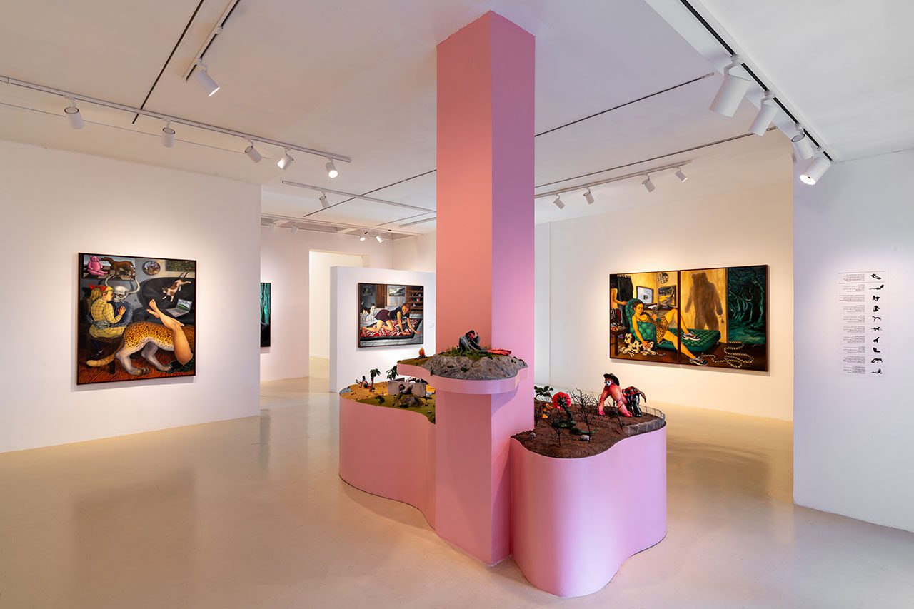״גם פה זה שילוב. את תנוחות הגוף שלהן אני יוצרת או מהדימיון או כמחווה לעבודת אמנות אחרת, אבל את הבשר עצמו אני מציירת מהתבוננות ישירה בחלקי גוף נפרדים שלי. יש לי מראה בסטודיו שבה אני מסתכלת כל פעם על פרגמנטים אחרים בגוף שלי, שמרכיבים את הדמויות.